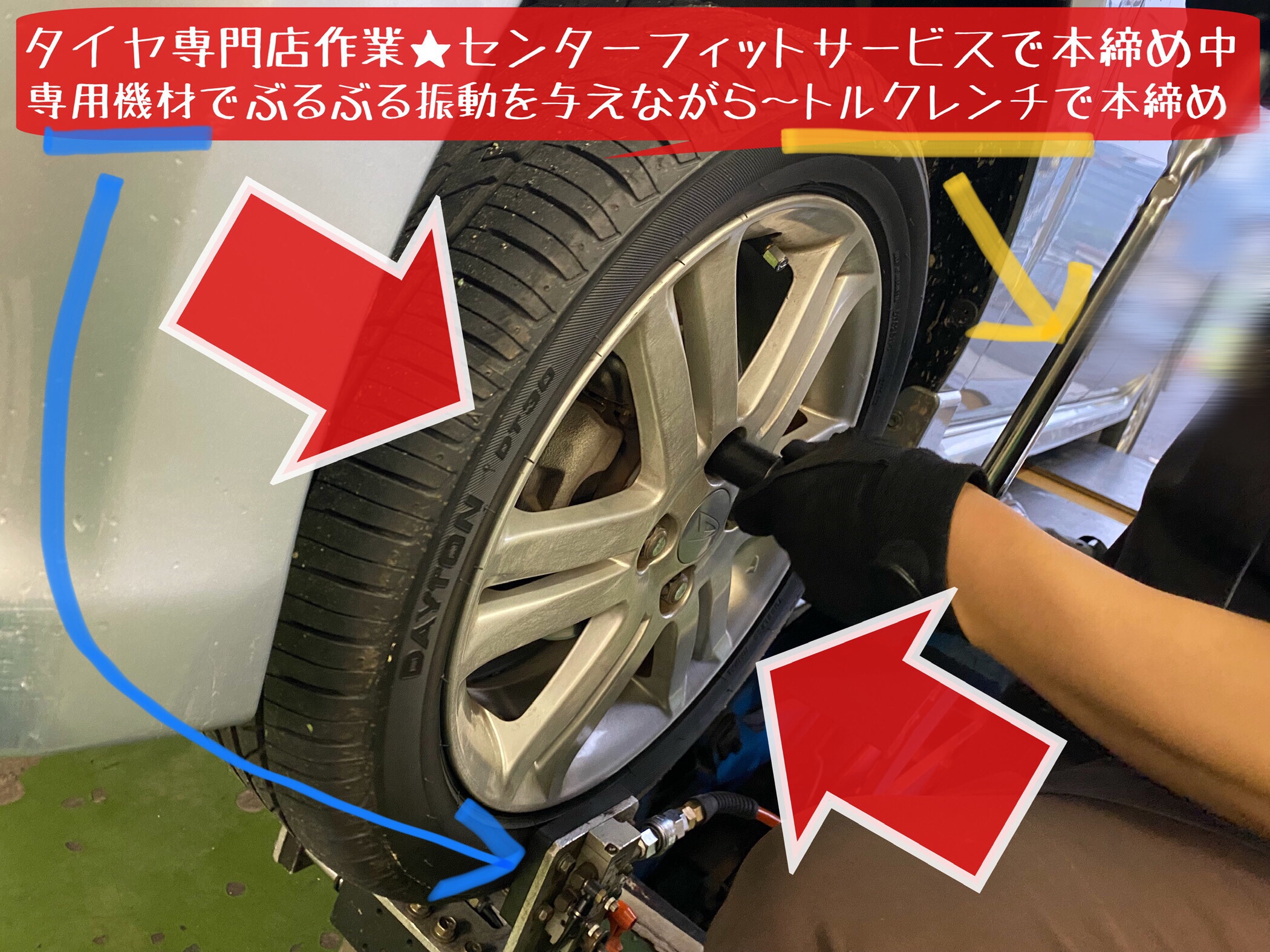 タイヤホイールに専用機材で〜ぶるぶる振動を与えながら〜しっかり丁寧に〜適正な力(トルク)で本締めしていきます。
