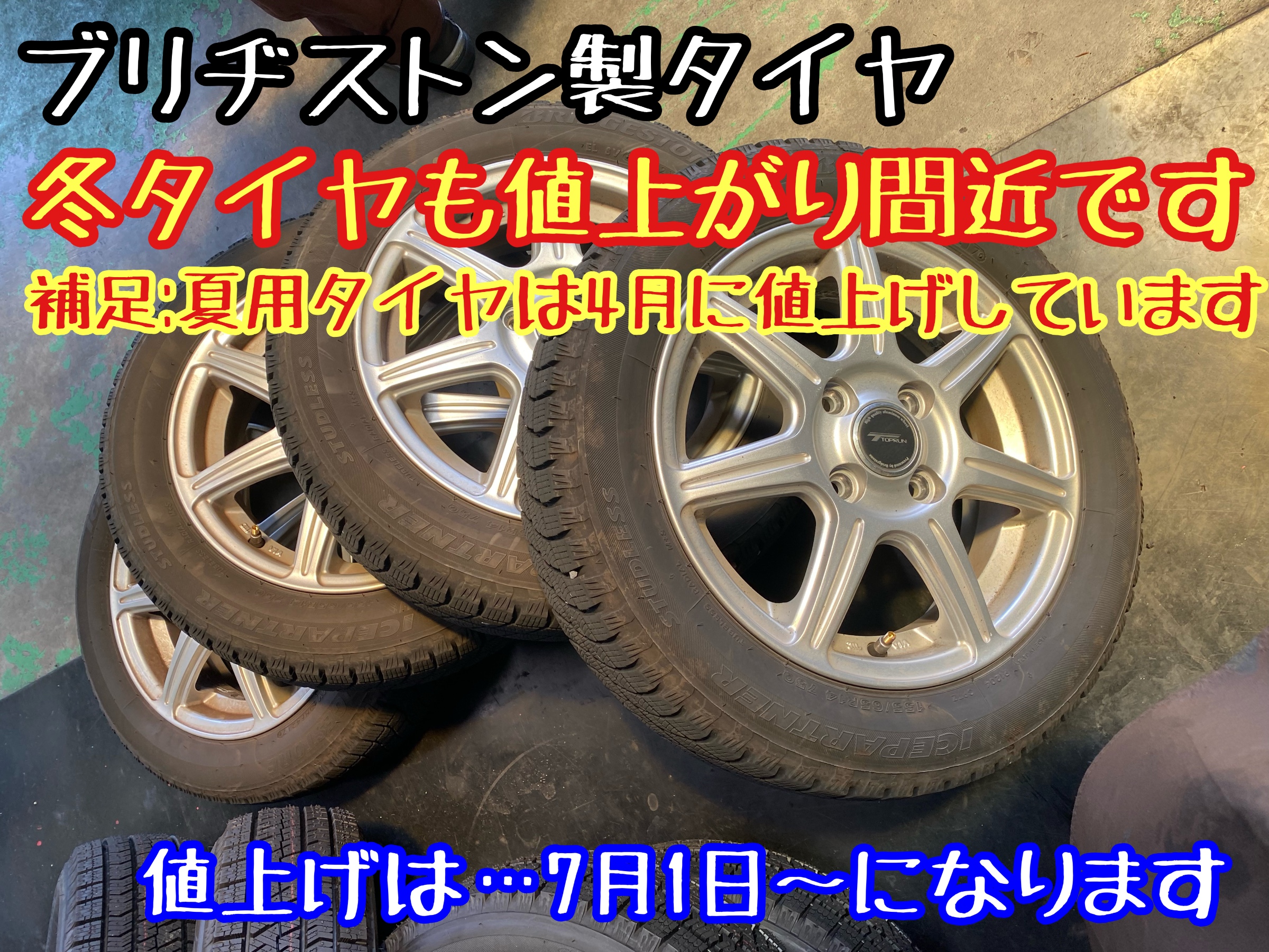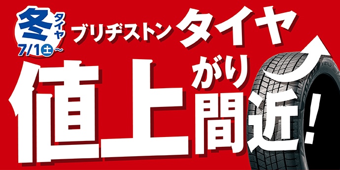 店舗からのお知らせ ポスト 2023年6月23日 おはようございます。 店舗からのお知らせ ブリヂストン冬タイヤ価格改定のお知らせ。 ブリヂストン製の冬タイヤ スタッドレスタイヤは7月1日から値上げになります。 タイヤ館 下松 住所:744-0041山口県下松市大字山田93-1 電話番号: 0833-46-0887 タイヤ点検・安全点検/タイヤ履き替え/オイル交換/その他ピット作業の予約 担当:越智