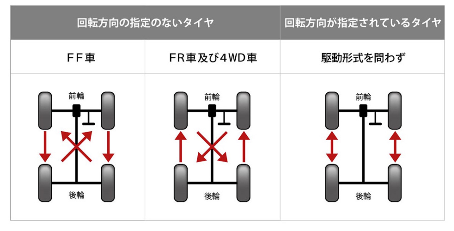 補足: 具体的な位置交換の方法はタイヤの種類やクルマの駆動方式によって異なります。参考までに位置交換例を上の図で示しましたが、前後で異なるサイズ表示(ロードインデックスの違いも含む)のタイヤが装着されている場合、このようなローテーションは行えません。