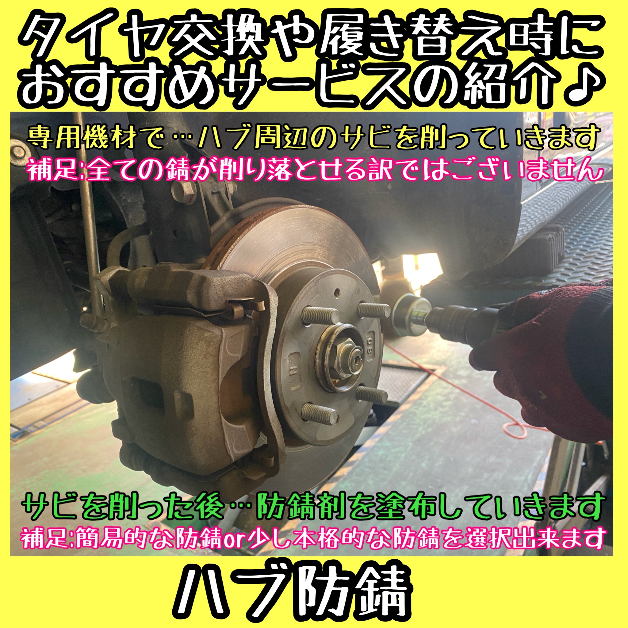 タイヤ交換と一緒にハブ防錆施工 ホイール取付面を綺麗にしますよ。