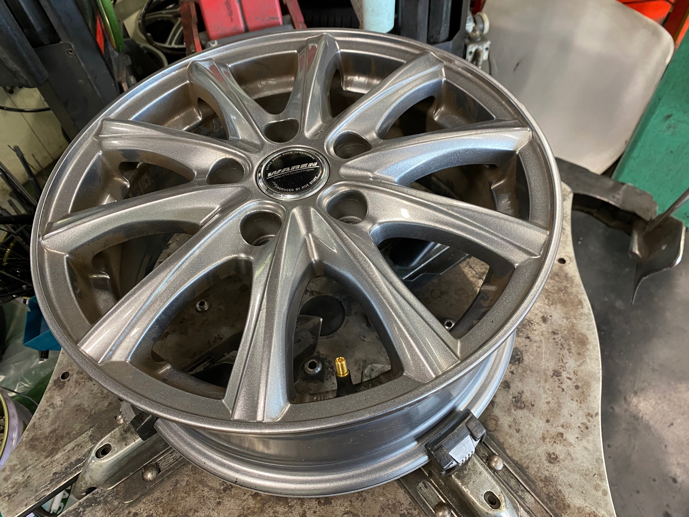 新しいタイヤ組み込み前の下準備実施。