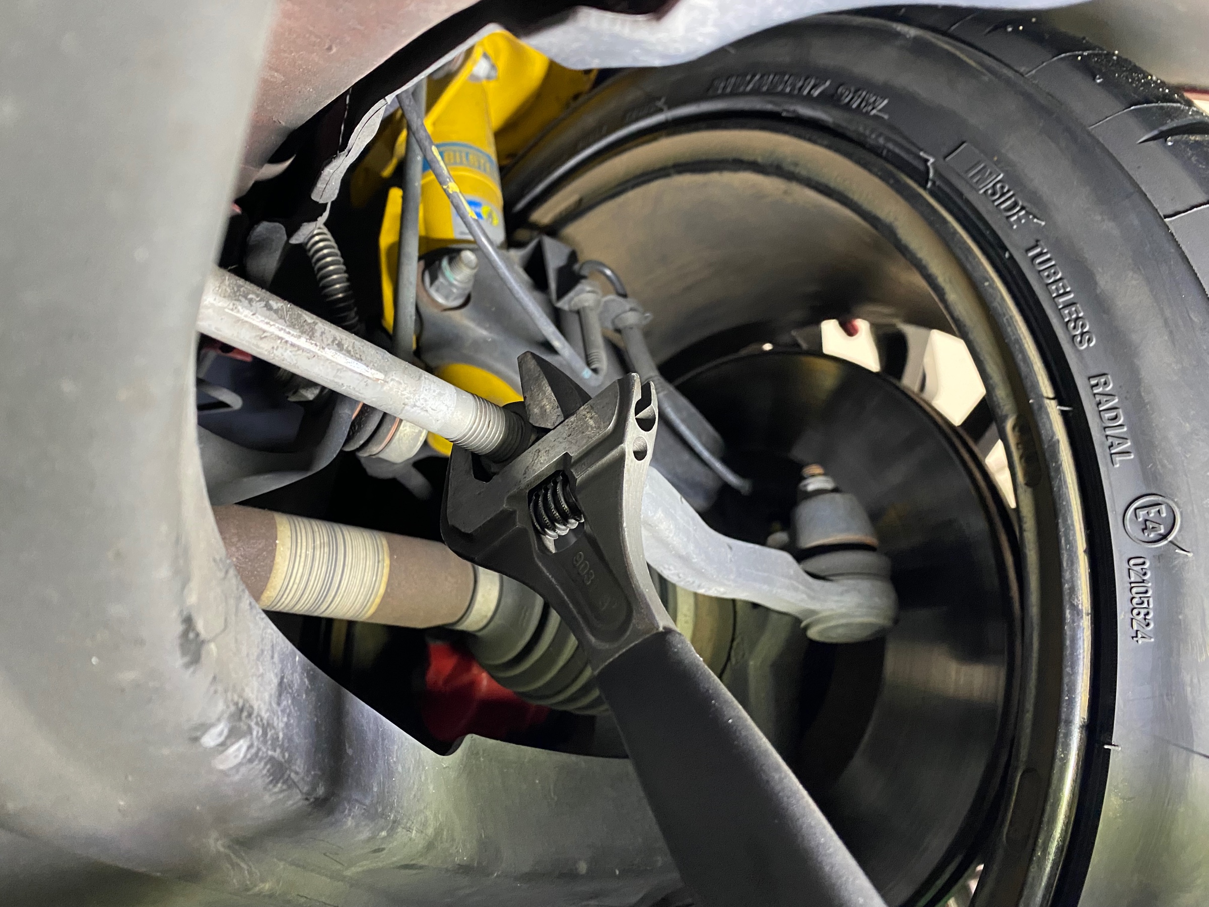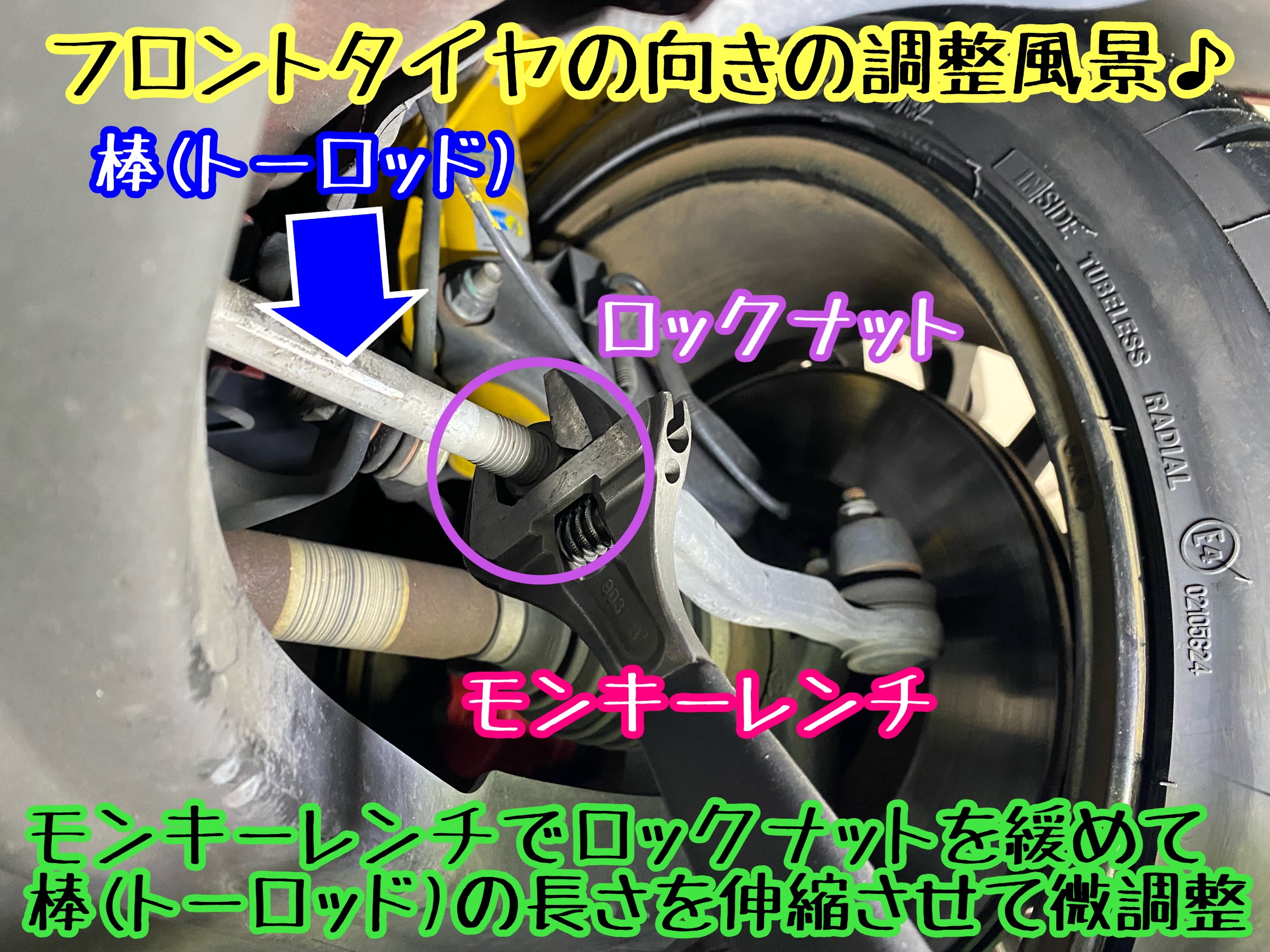 アライメント調整風景〜フロントタイヤの向きの調整風景。
