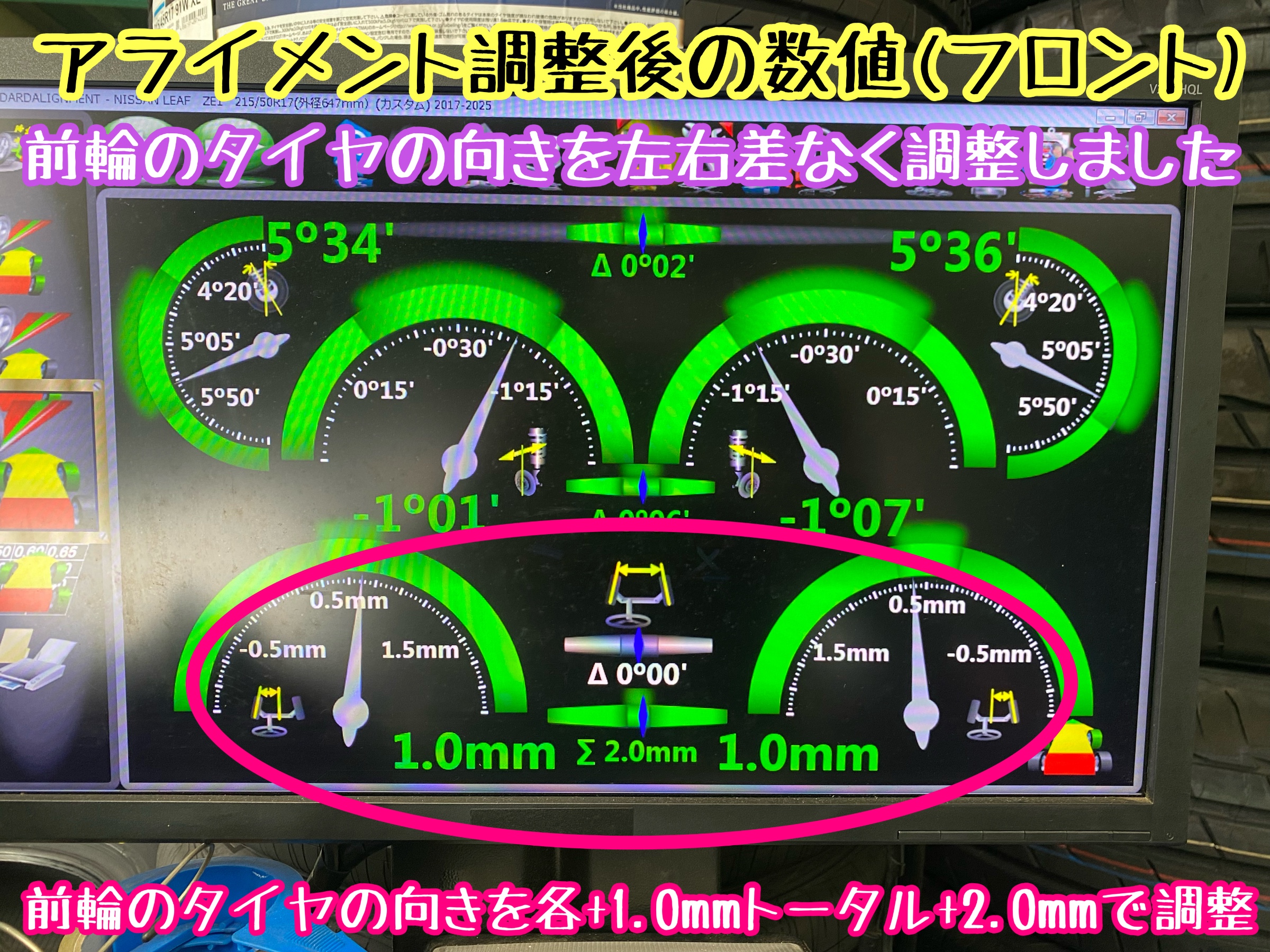 アライメント測定後の数値〜フロント&リヤ。
