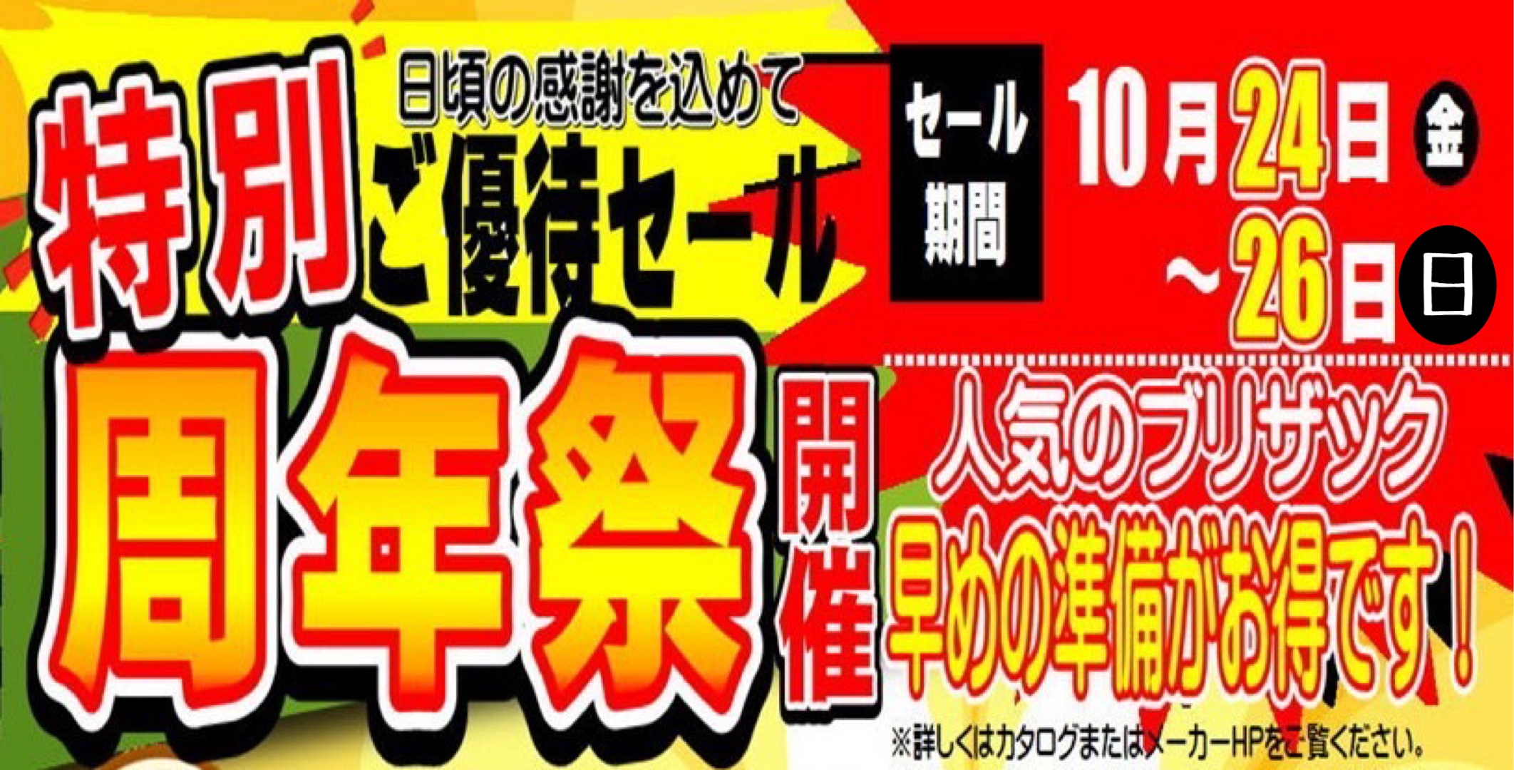 お知らせ〜周年祭開催します。 ポスト 2025年10月12日 おはようございます。 タイヤ館下松店では 10月24日(金曜日)25日(土曜日)26日(日曜日) 毎年恒例の周年祭を開催します。 夏冬タイヤ購入を検討されている皆さま…是非この機会をお見逃しなく。 タイヤ館 下松 住所:744-0041山口県下松市大字山田93-1 電話番号: 0833-46-0887 カテゴリ:タイヤ関連 担当:越智