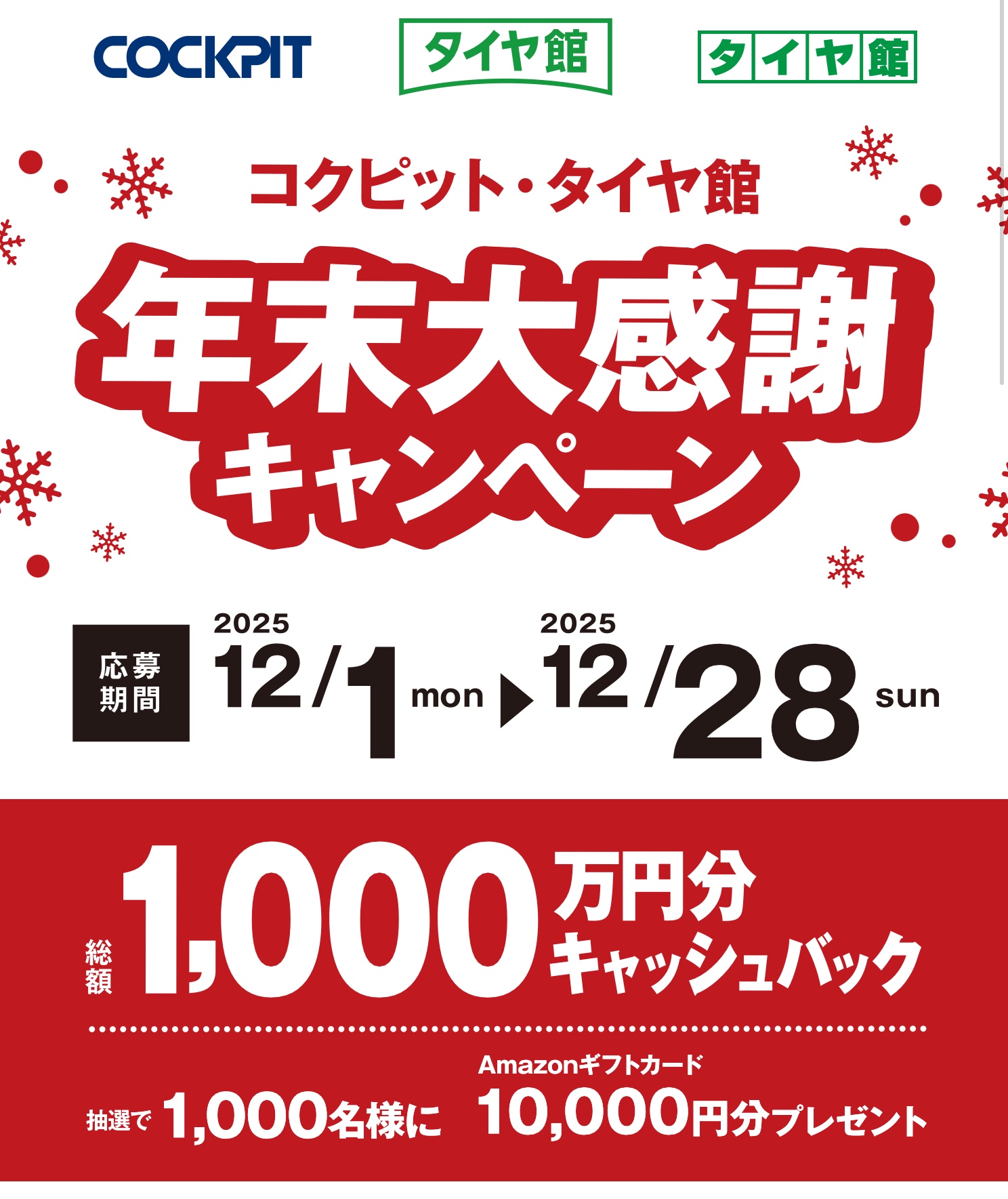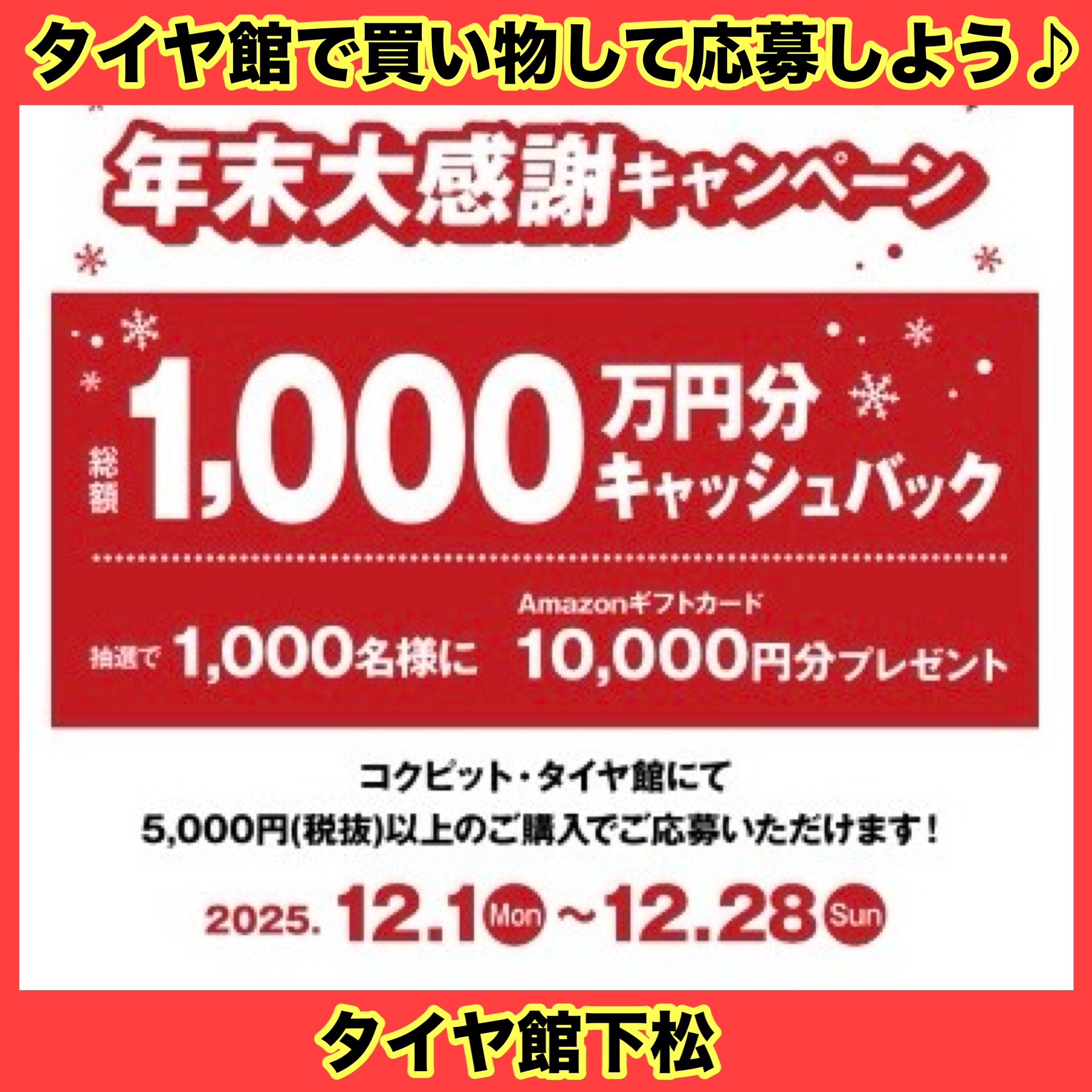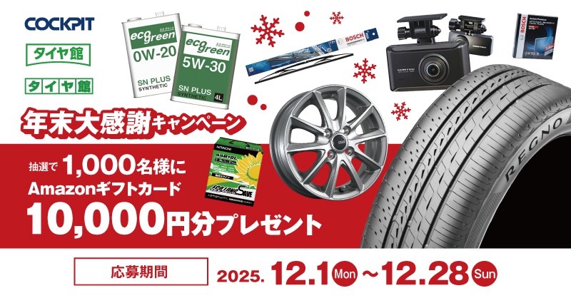 コクピット・タイヤ館 年末大感謝キャンペーンの応募期間は12/28(日)までとなっております!
