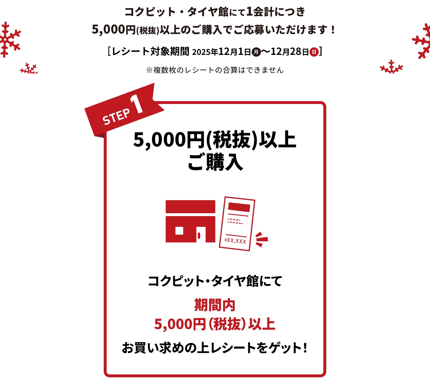 コクピット・タイヤ館で、対象期間中に1会計につき5,000円(税抜)以上(合算不可)の