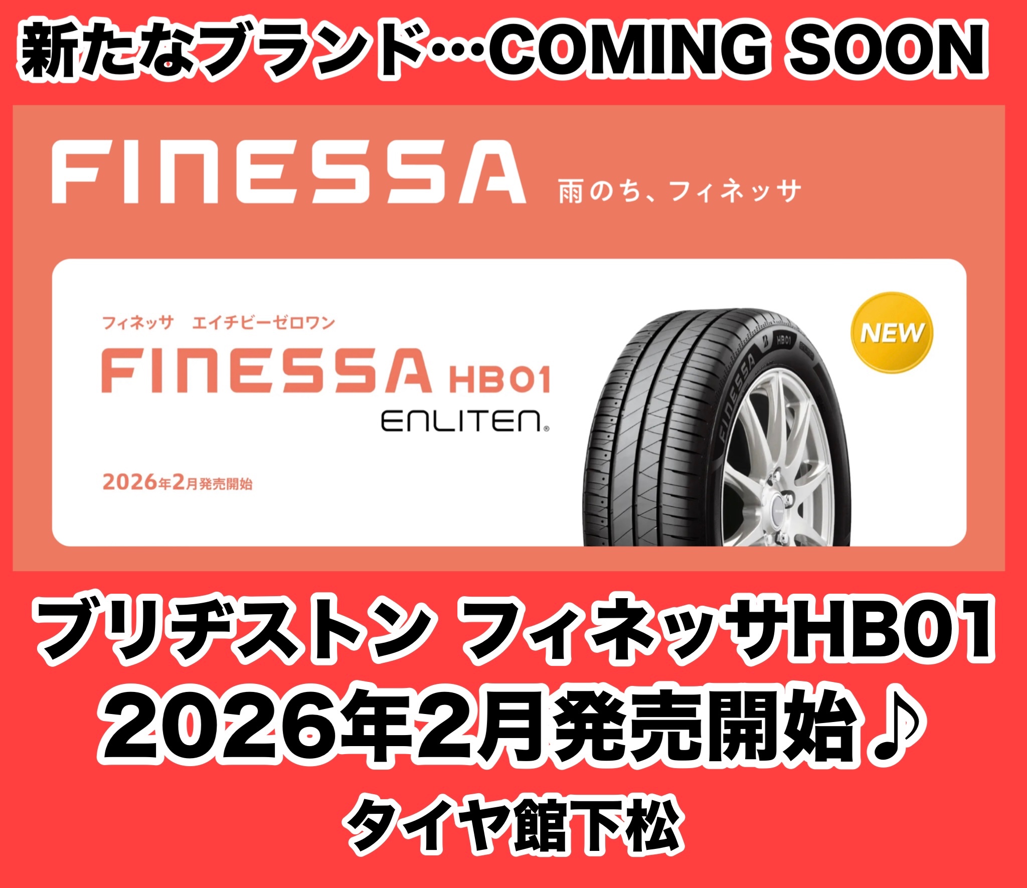 新たなブランド…COMING SOON。 ポスト 2026年1月14日 おはようございます。 ブリヂストン フィネッサHB01 タイヤ館 下松 住所:744-0041山口県下松市大字山田93-1 電話番号: 0833-46-0887 カテゴリ:タイヤ関連 担当:越智
