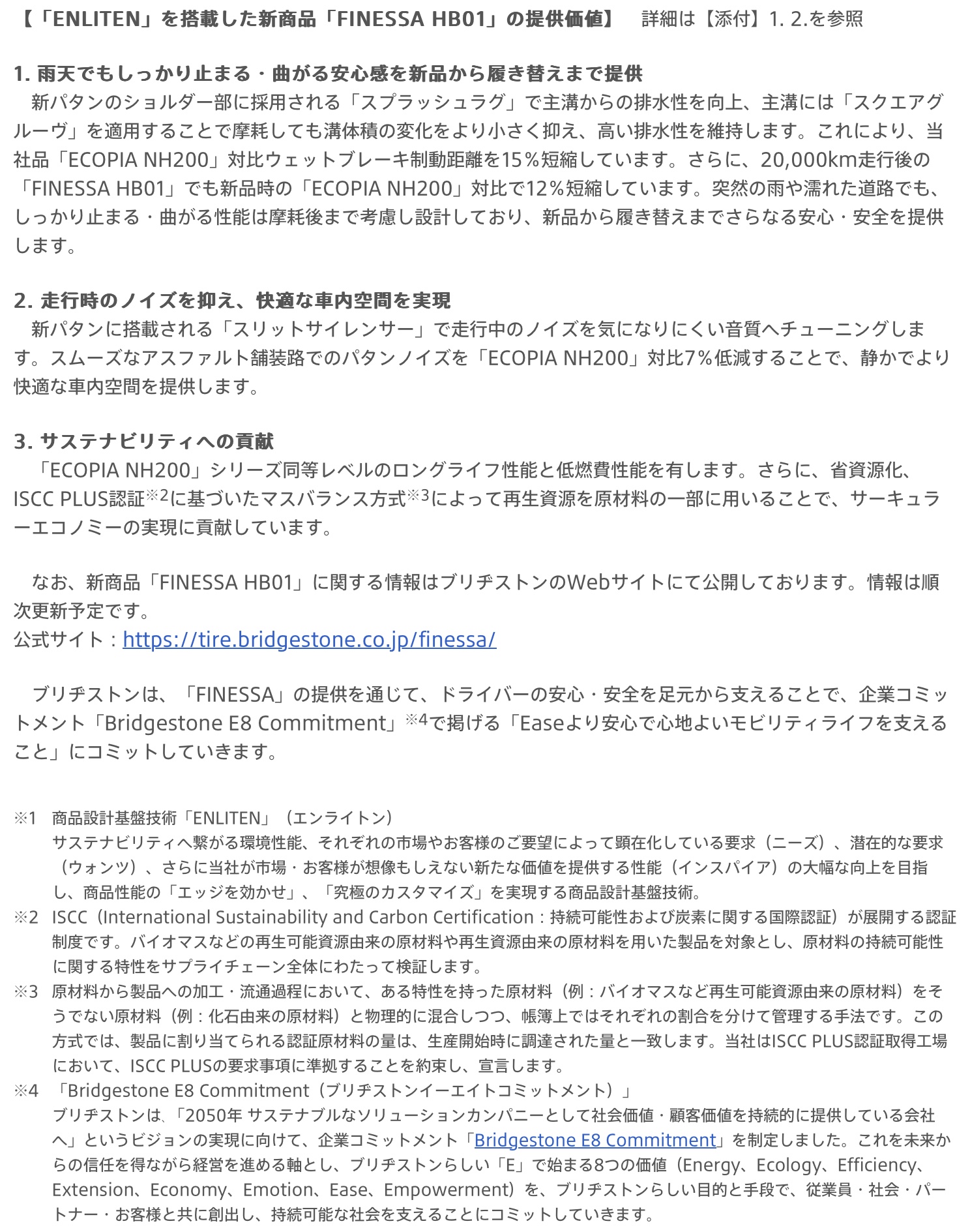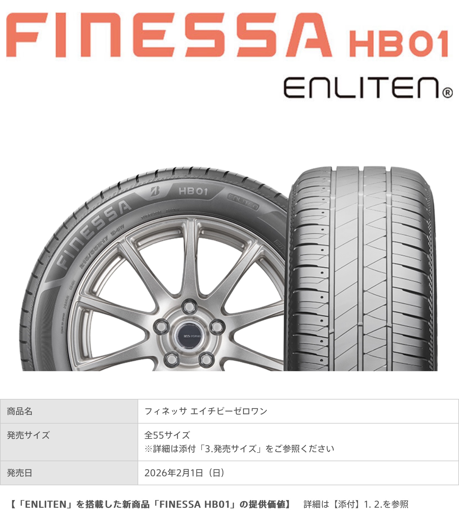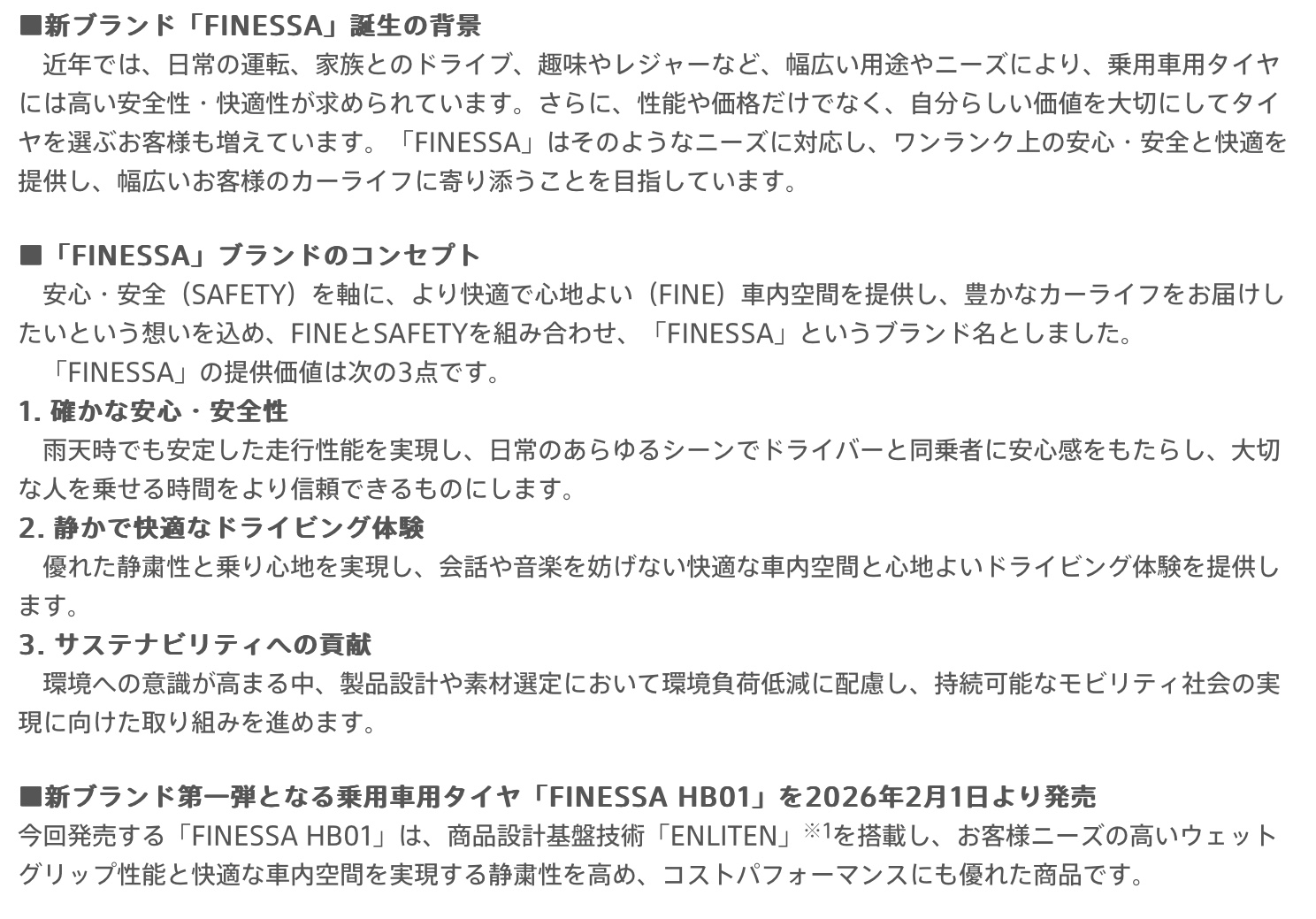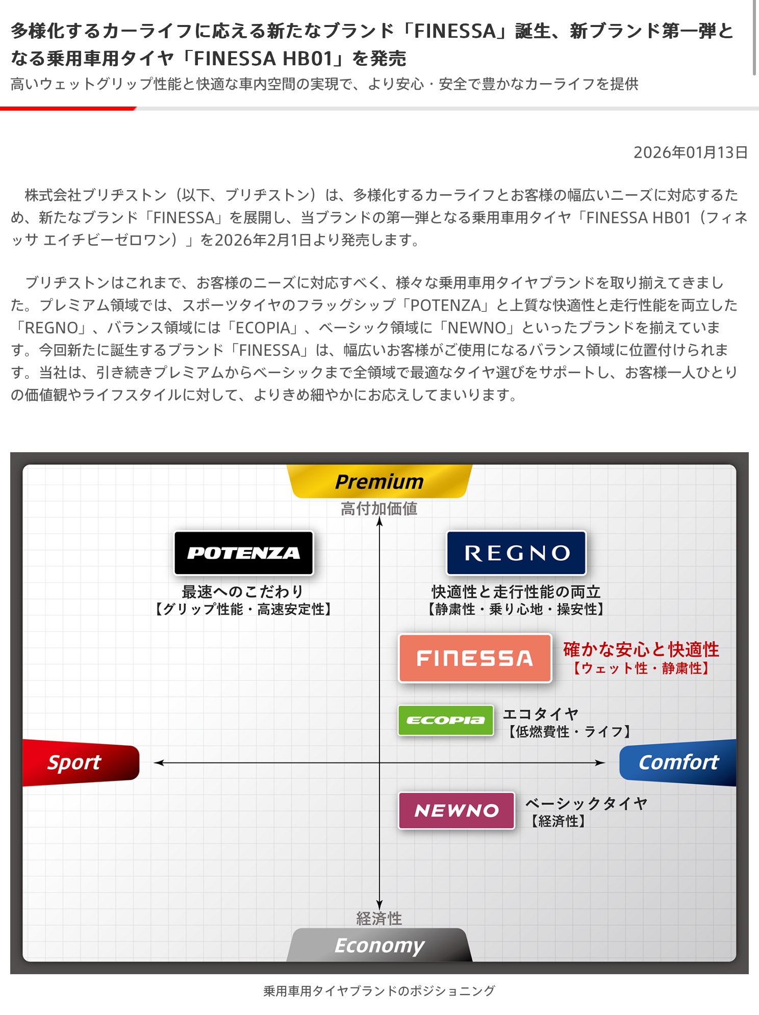 ニュースリリース〜多様化するカーライフに応える新たなブランド「FINESSA」誕生、新ブランド第一弾となる乗用車用タイヤ「FINESSA HB01」を発売 ポスト 2026年1月14日 おはようございます。 ニュースリリース〜多様化するカーライフに応える新たなブランド「FINESSA」誕生、新ブランド第一弾となる乗用車用タイヤ「FINESSA HB01」を発売 ブリヂストン フィネッサHB01 タイヤ館 下松 住所:744-0041山口県下松市大字山田93-1 電話番号: 0833-46-0887 カテゴリ:タイヤ関連
