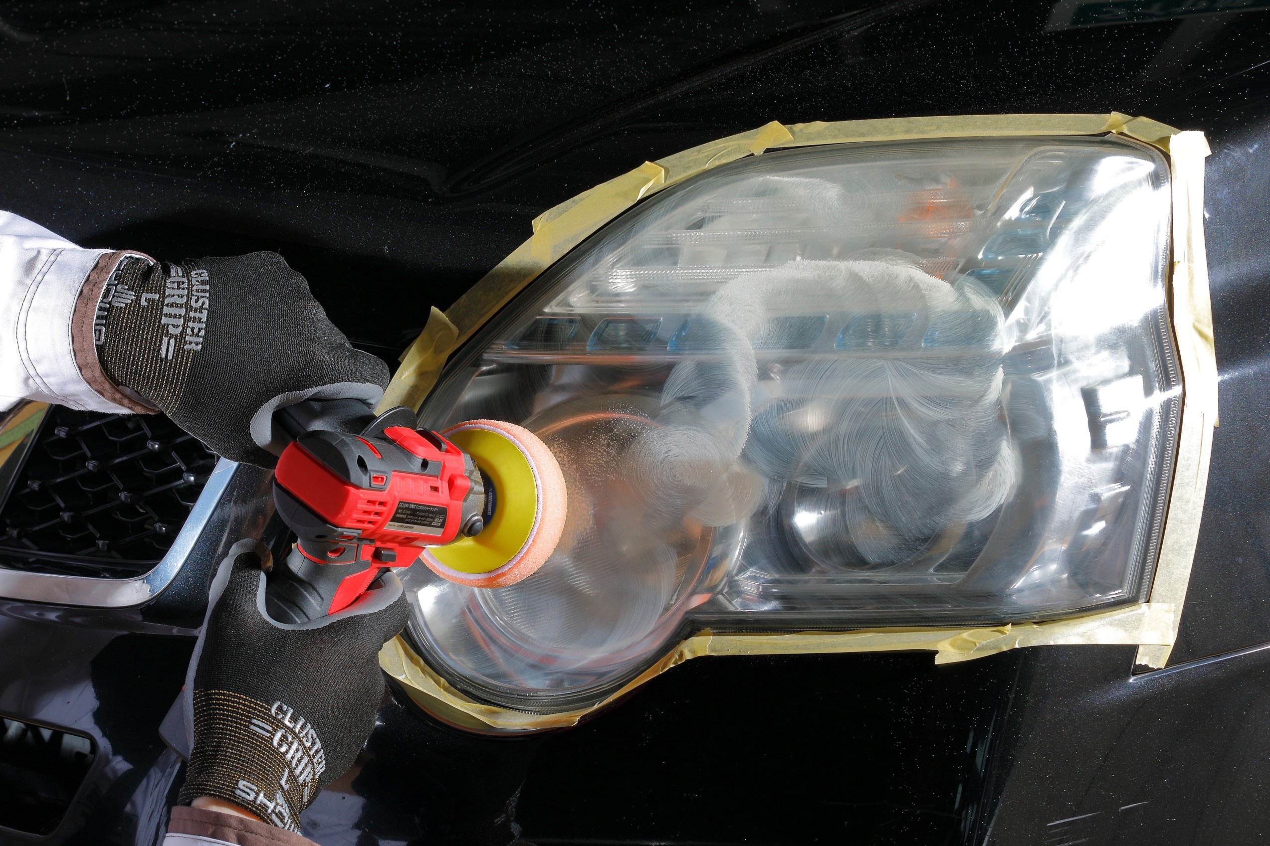 作業工程は大きくわけて2段階。レンズ周りをマスキングテープで養生し、ヘッドライト専用のコンパウンド(研磨剤)でレンズ表面の黄ばみやくすみをきれいにはがします。ただし、これだけですとまた劣化が進んでしまうので、コーティング剤を塗布することで、輝きを取り戻したレンズを守ります。
