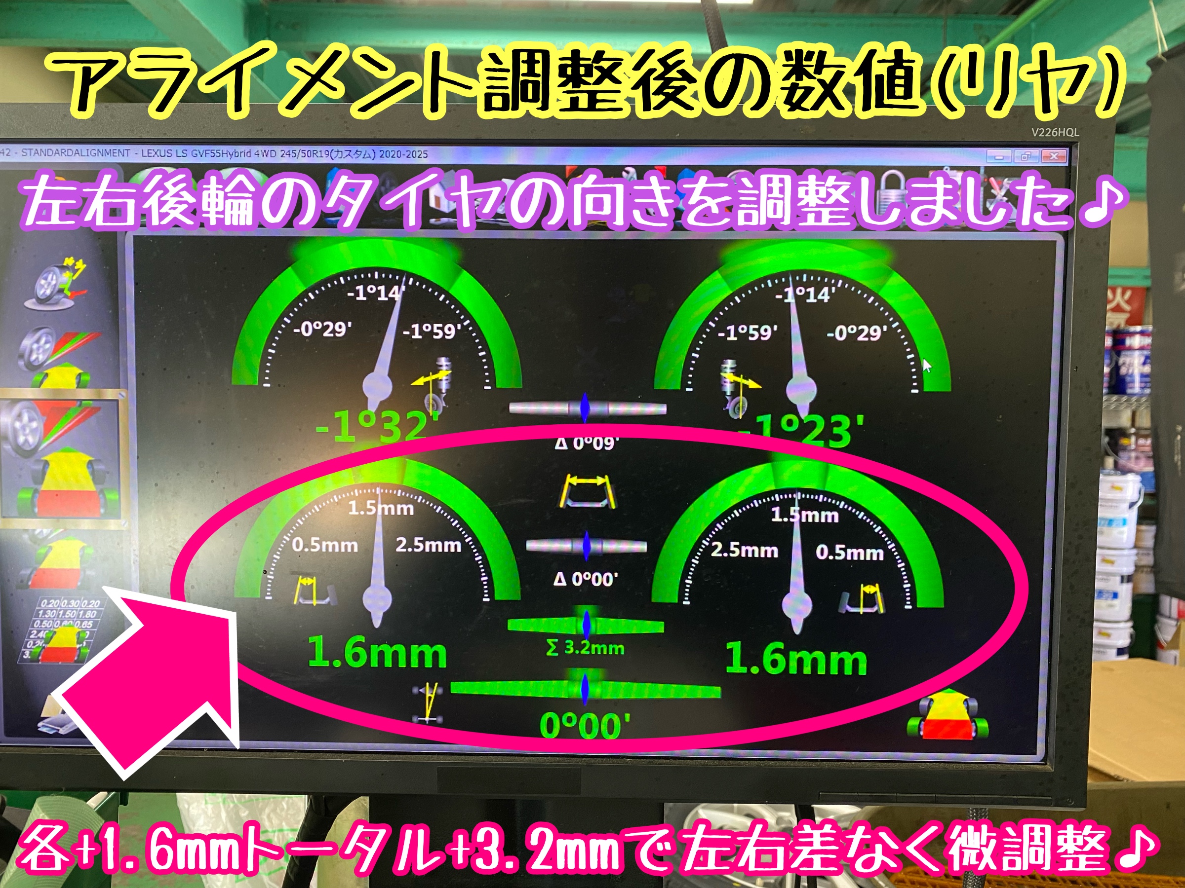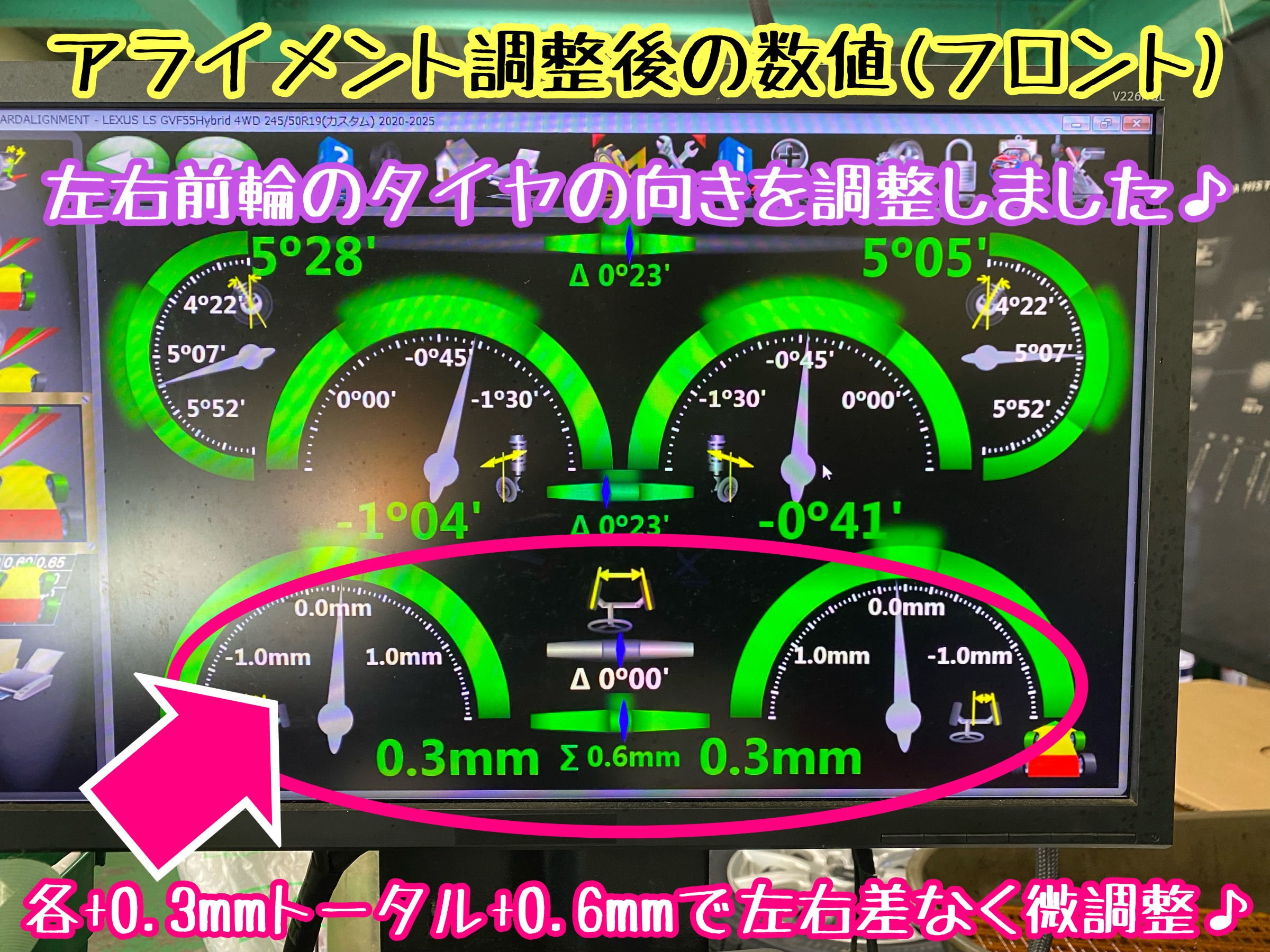 レクサスLS500h GVF55型 足廻りの部品交換後にアライメント調整実施。足廻りの部品を取り外すとタイヤの向きや角度がズレる可能性が高いですよ。(アライメント調整後の数値や調整風景の画像追加)
