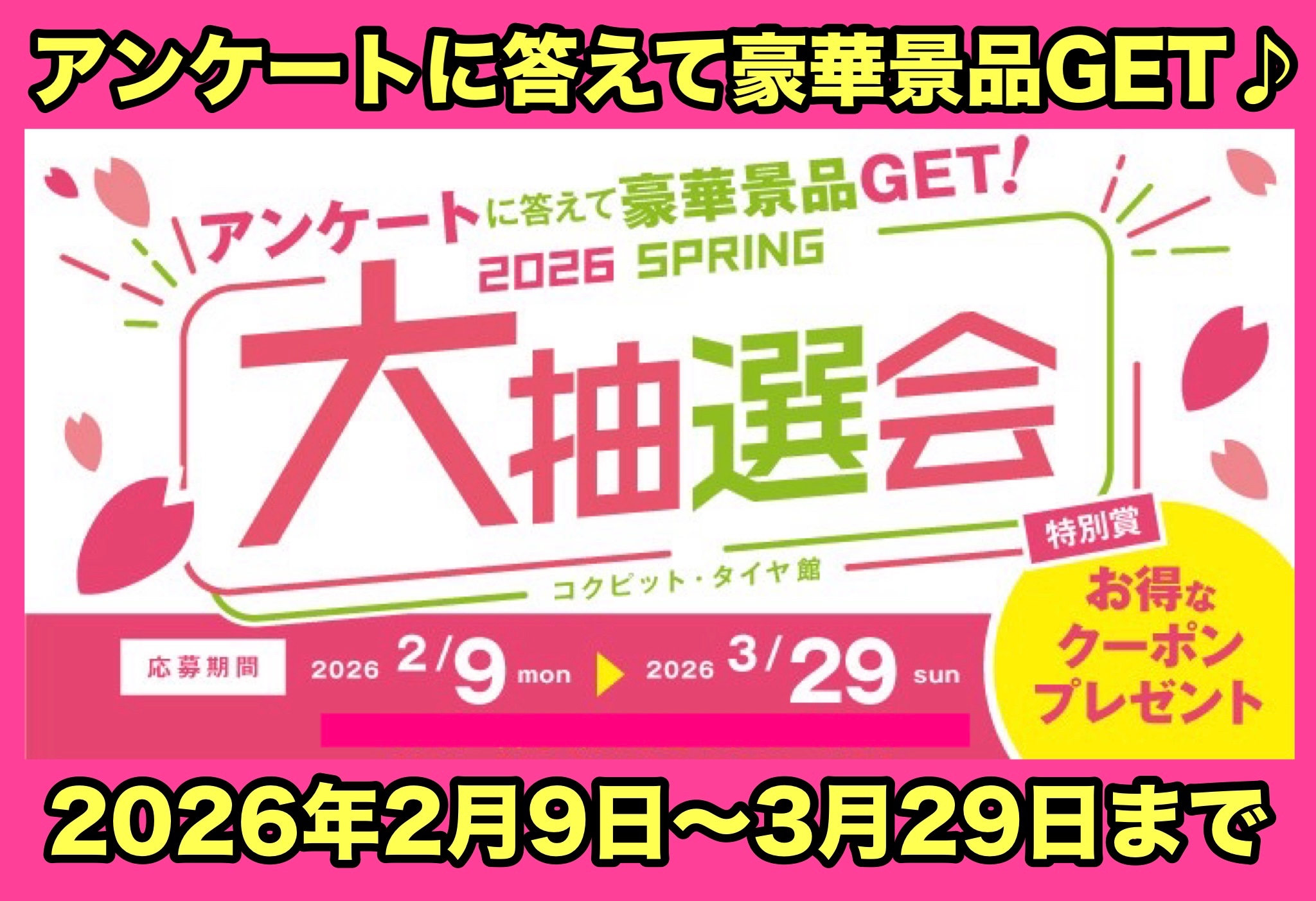 春の大抽選会の応募期間は3/29(日)までとなっております!
