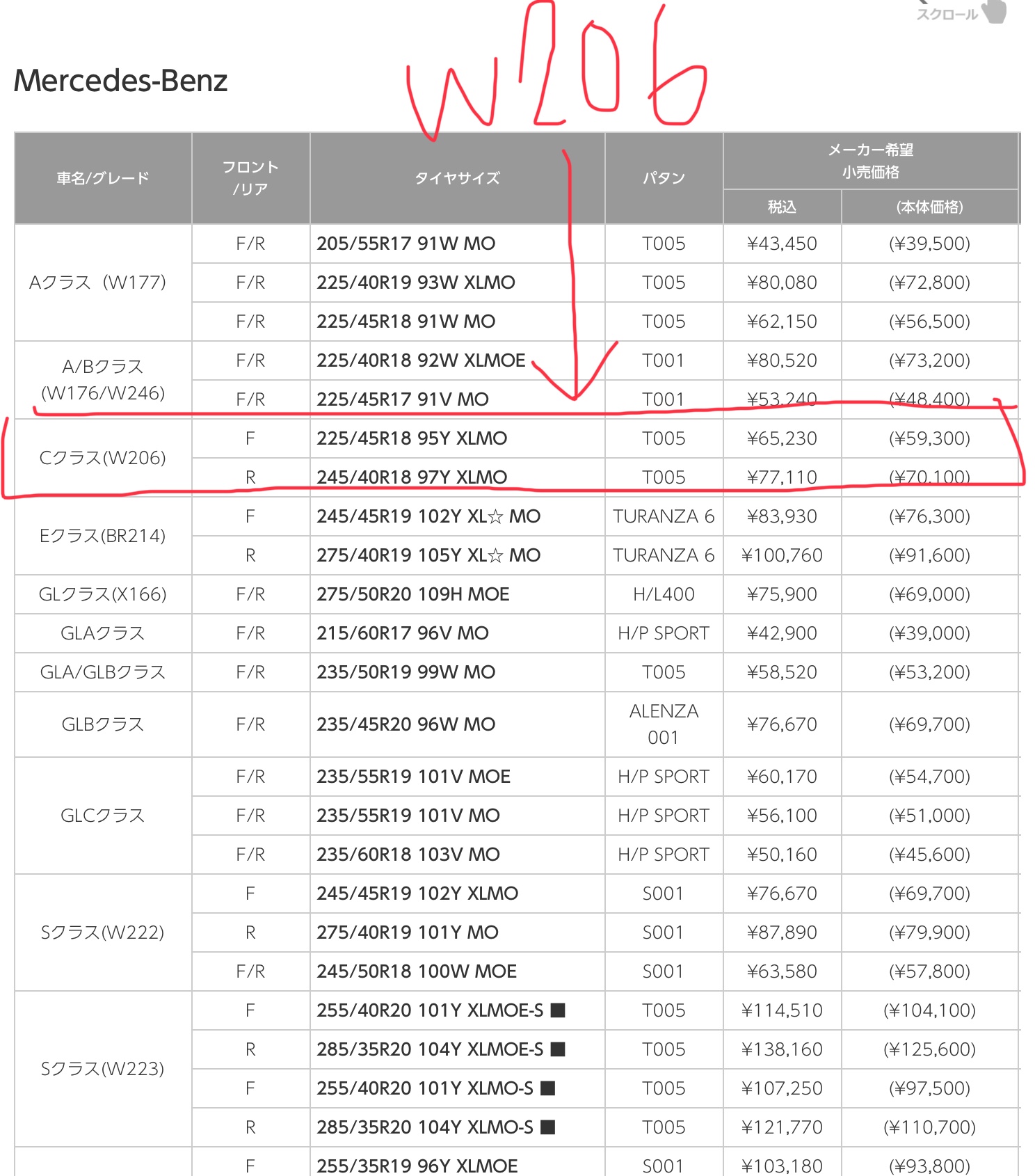 補足:下の画像はCクラス W206型の新車装着タイヤになります。