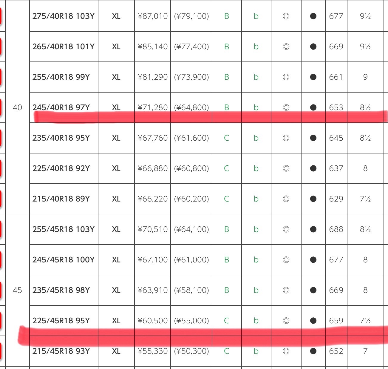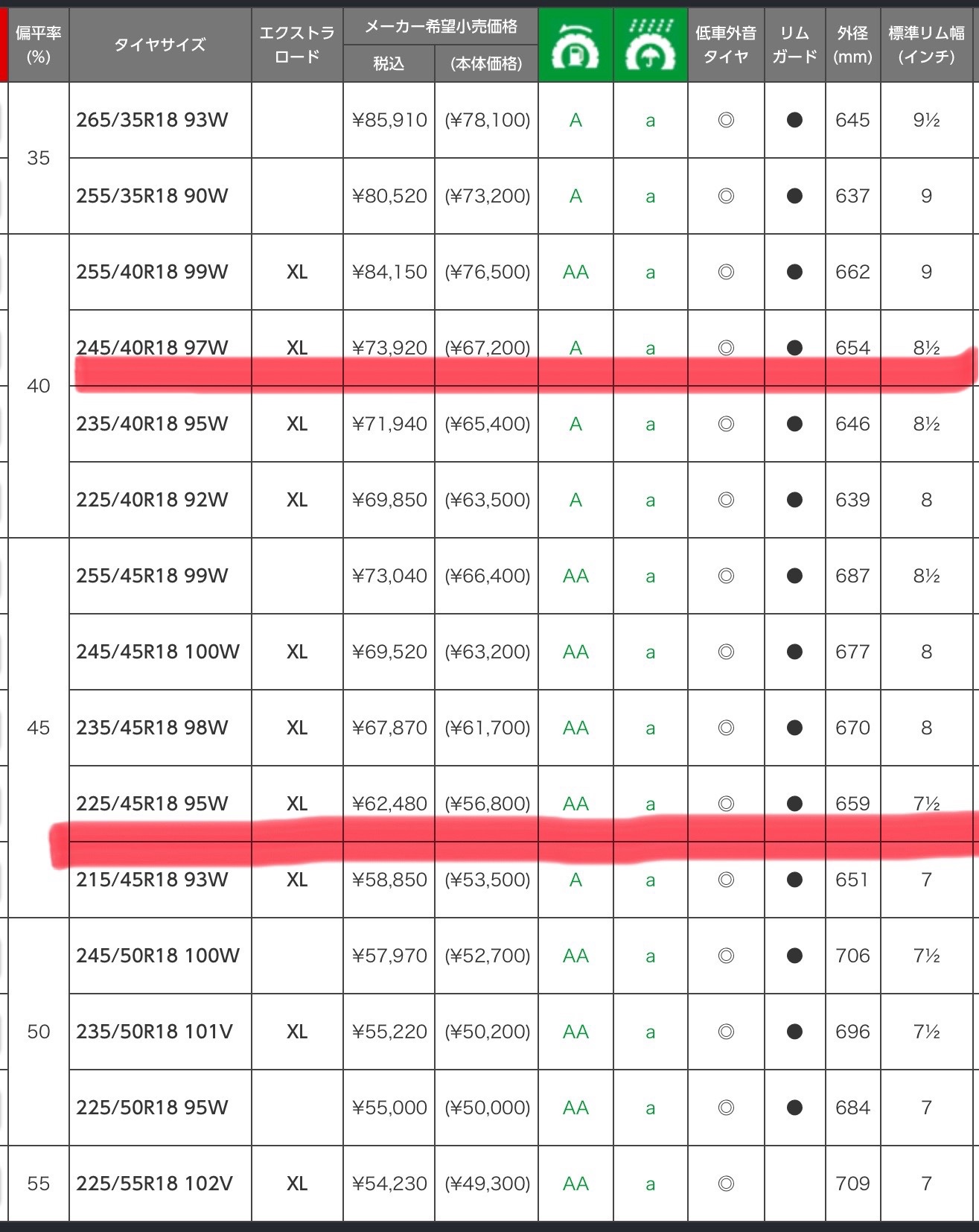 フロントタイヤ 225/45R18 95Y