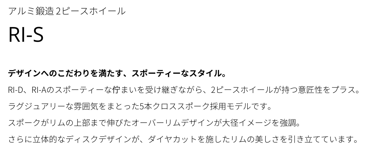 RI-D、RI-Aのスポーティーな佇まいを受け継ぎながら、2ピースホイールが持つ意匠性をプラス。