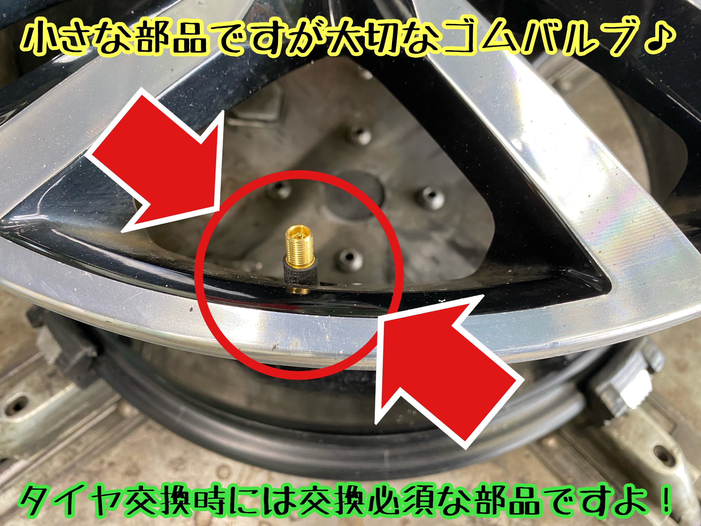 小さなパーツですが、空気圧調整には欠かせないのがエアバルブ。タイヤ専門店としてこのような部分もしっかり点検いたしますので、タイヤをはじめとする無料安全点検をぜひご利用くださいね。