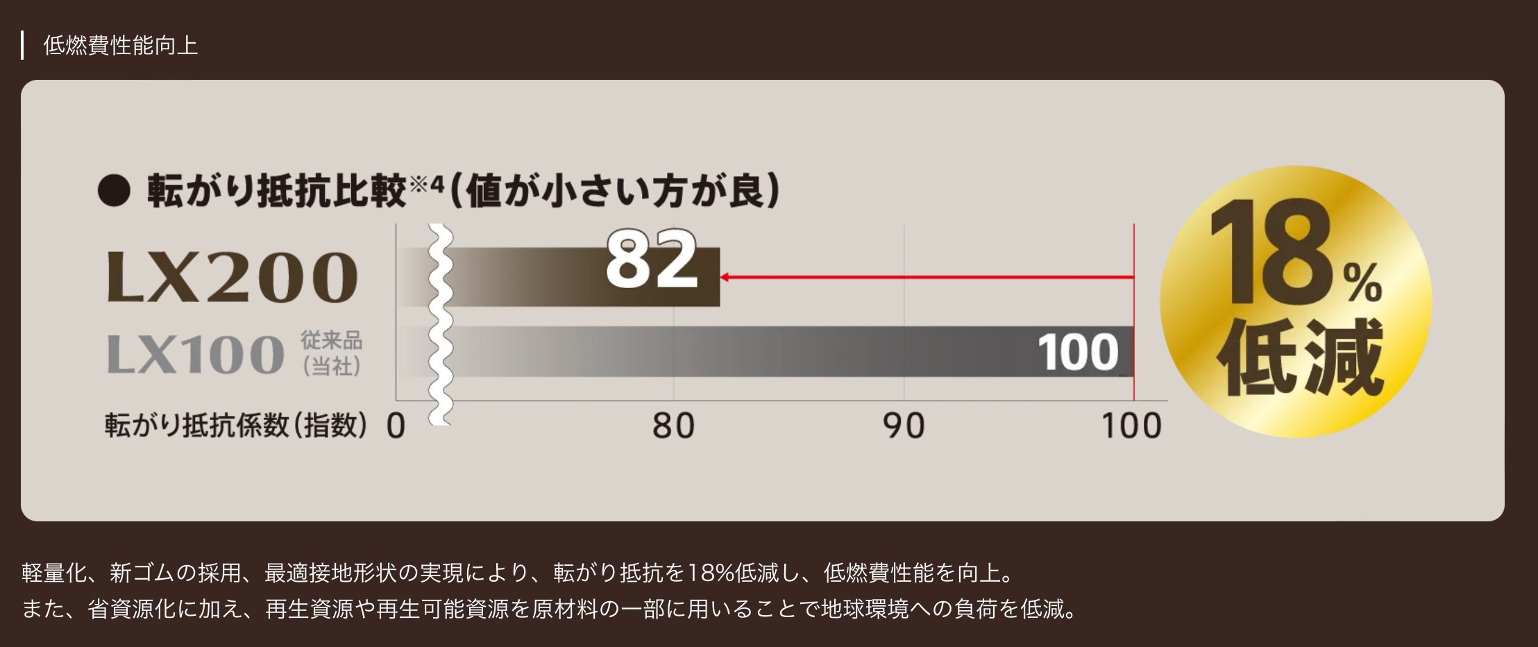 軽量化、新ゴムの採用、最適接地形状の実現により低燃費性能を向上しました。また、省資源化に加え、再生資源や再生可能資源を原材料の一部に用いることで地球環境への負荷を低減しています。