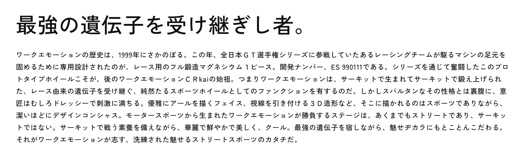 ワークエモーションの歴史は、1999年にさかのぼる。この年、全日本GT選手権シリーズに参戦していたあるレーシングチームが駆るマシンの足元を固めるために専用設計されたのが、レース用のフル鍛造マグネシウム1ピース。開発ナンバー、ES 990111である。シリーズを通じて奮闘したこのプロトタイプホイールこそが、後のワークエモーションCRkaiの始祖。つまりワークエモーションは、サーキットで生まれてサーキットで鍛え上げられた、レース由来の遺伝子を受け継ぐ、純然たるスポーツホイールとしてのファンクションを有するのだ。しかしスパルタンなその性格とは裏腹に、意匠はむしろドレッシーで刺激に満ちる。優雅にアールを描くフェイス、視線を引き付ける3D造形など、そこに描かれるのはスポーツでありながら、潔いほどにデザインコンシャス。モータースポーツから生まれたワークエモーションが勝負するステージは、あくまでもストリートであり、サーキットではない。サーキットで戦う素養を備えながら、華麗で鮮やかで美しく、クール。最強の遺伝子を宿しながら、魅せヂカラにもとことんこだわる。それがワークエモーションが志す、洗練された魅せるストリートスポーツのカタチだ。