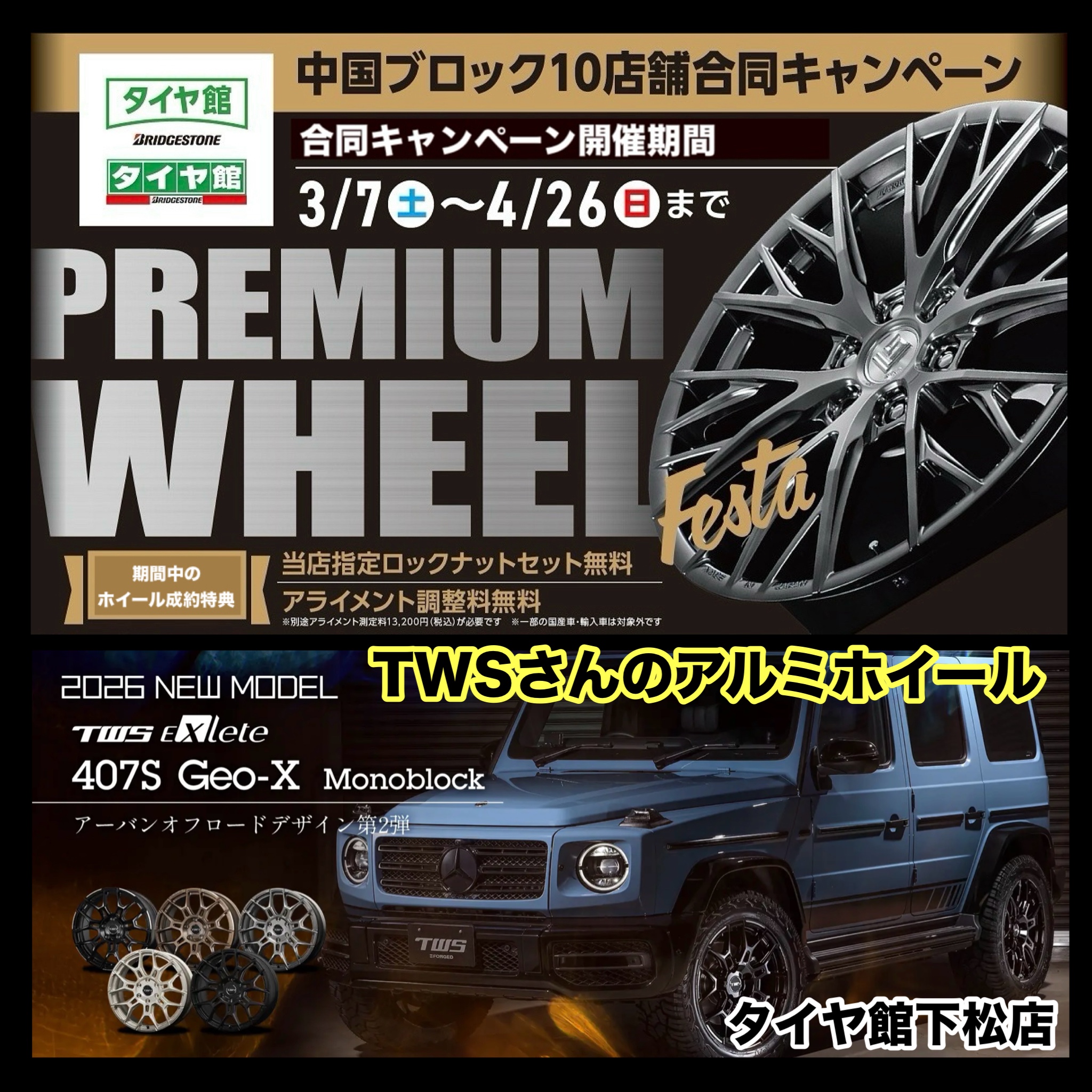 TWSさんのアルミホイール紹介。 ポスト 2026年4月8日 おはようございます。 本日はTWSさんのアルミホイール紹介になります。 TWSさんのホームページ TWSさんのアルミホイール TWSさんの車種別マッチング 中国ブロックのタイヤ館10店舗で合同アルミホイールイベント開催中。 下松店は4月18日(土曜日)19日(日曜日)になります。 タイヤ館 下松 住所:744-0041山口県下松市大字山田93-1 電話番号: 0833-46-0887 カテゴリ:ホイール関連 担当:越智