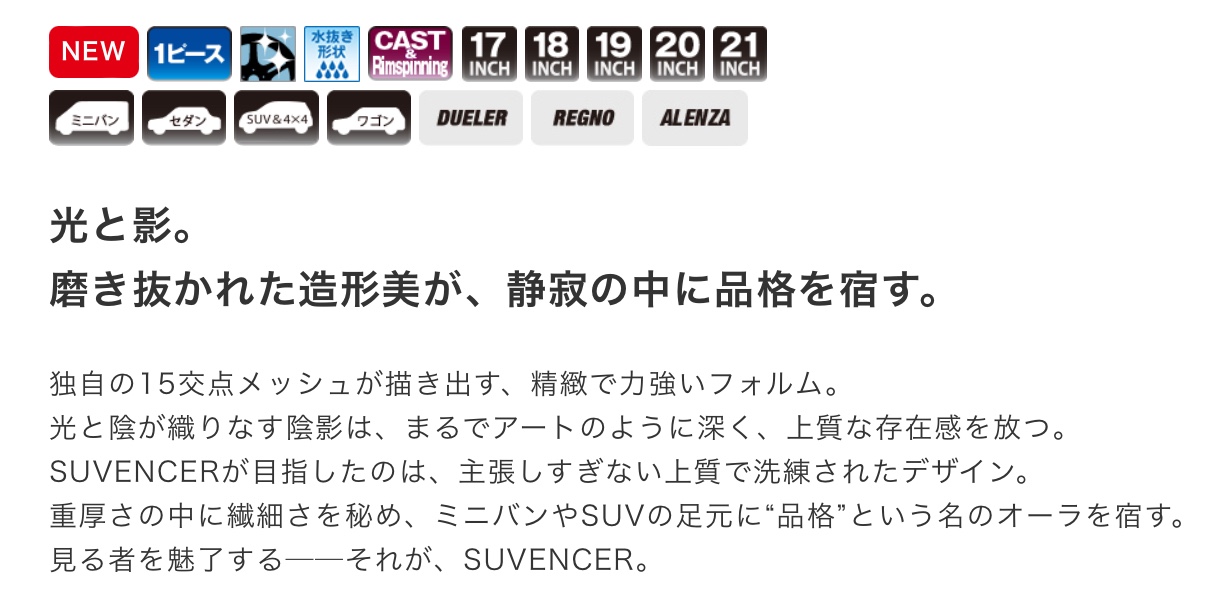 重厚さの中に繊細さを秘め、ミニバンやSUVの足元に“品格”という名のオーラを宿す。