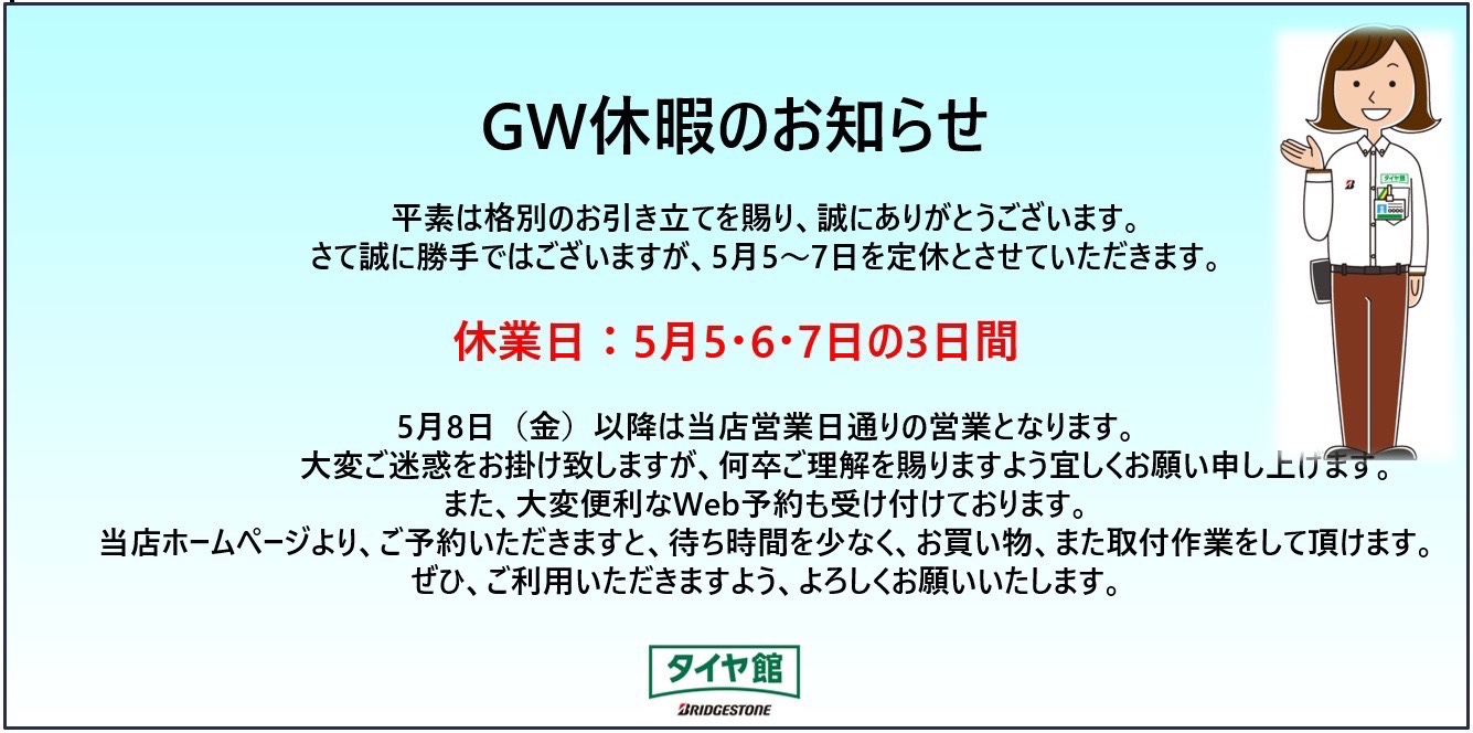 店舗からのお知らせ ポスト 2026年4月23日 店舗からのお知らせ GW休暇のお知らせ 5月5日(火曜日) 6日(水曜日) 7日(木曜日) の3日間は店舗定休日になります。 タイヤ館 下松 住所:744-0041山口県下松市大字山田93-1 電話番号: 0833-46-0887 カテゴリ:お知らせ 担当:越智