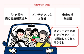 パンク時に安心なタイヤ交換保障に加え、購入後の手厚いタイヤメンテナンスが含まれているため、