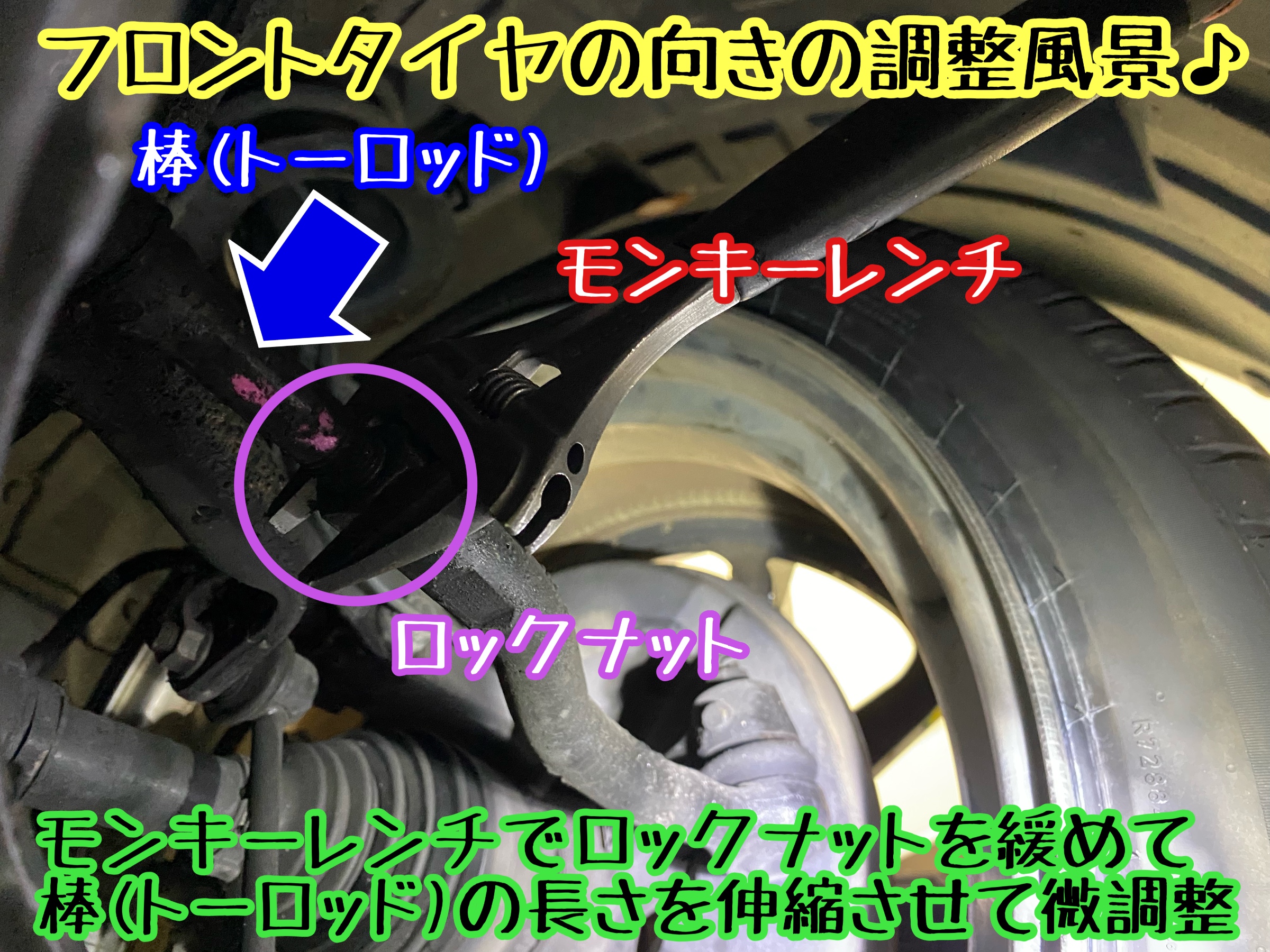 フロントタイヤの向きがかなり外向きだったので…リヤ調整前に一旦仮調整しました。