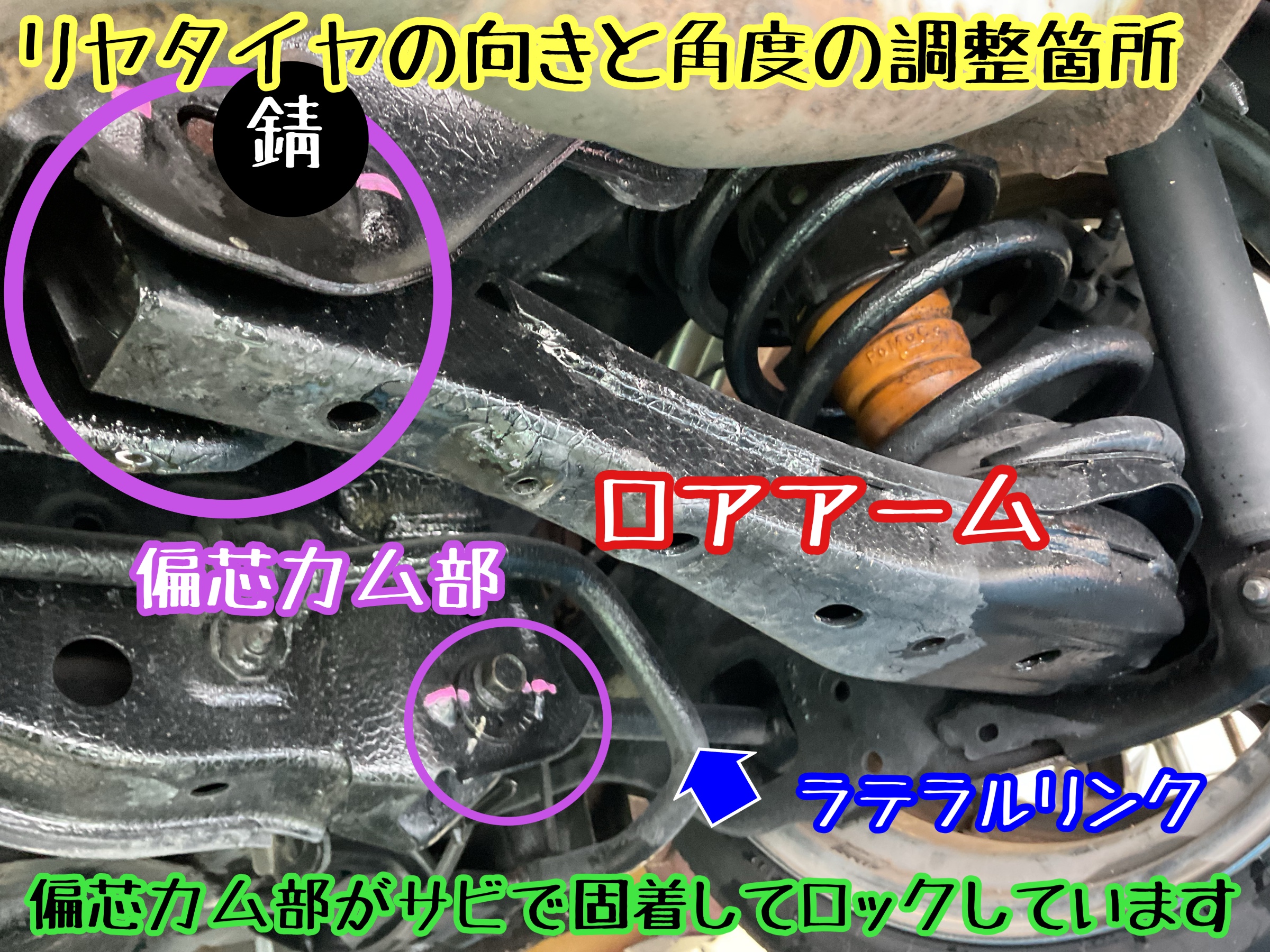 リヤ 可動部が固着でロックしていたのでブッシュのたわみを利用してタイヤの向きを調整。