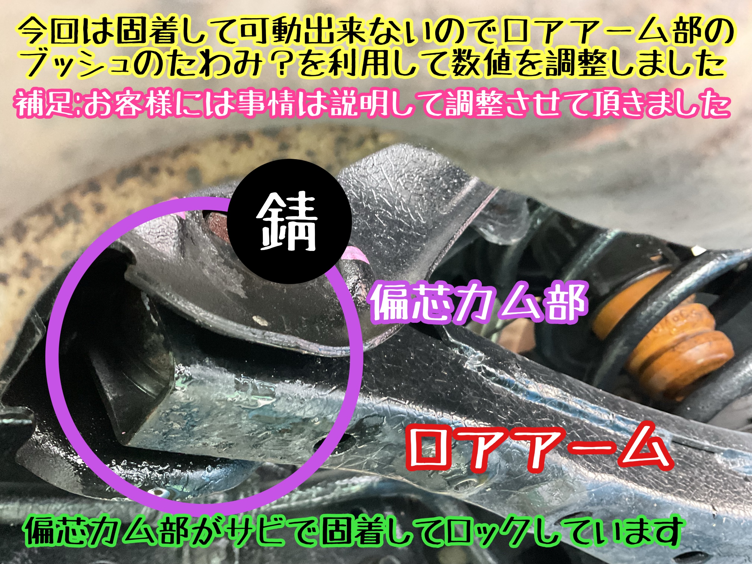 補足:ブッシュのたわみを利用して調整している(誤魔化してる?)ので、今後劣化や反動でズレる可能性がある事はお客様には説明して理解頂きました。