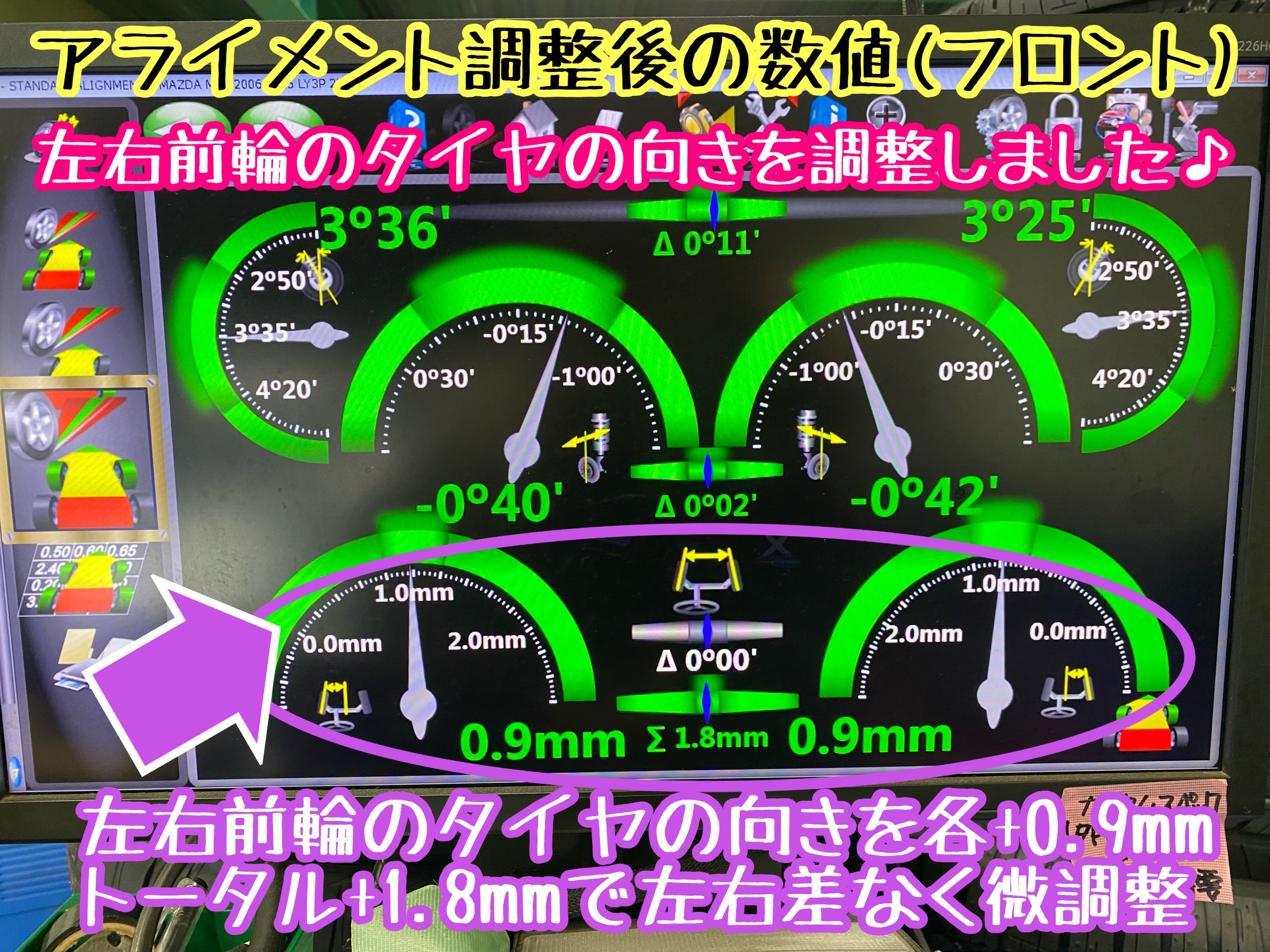 マツダ MPV LY3P型 冬タイヤから夏タイヤへの履き替え時にフロントタイヤの内減りが気になり〜アライメント測定&調整実施追加画像あり)。