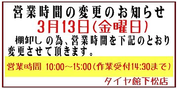 店舗からのお知らせ 営業時間変更のお知らせ 3月13日(金曜日) 棚卸しの為、営業時間を下記のとおり変更させていただきます。 営業時間 10:00〜15:00(作業受付14:30まで)
