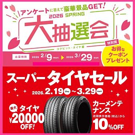いつも当店をご利用いただきまして、ありがとうございます。 Wチャンスですよ。 ①アンケートに答えて抽選参加!春の大抽選会開催中 ②ブリヂストンタイヤをお得に買える!スーパータイヤセールを開催中。 その① アンケートに答えて抽選参加!春の大抽選会開催中!! 2月9日(月)から、「春の大抽選会...