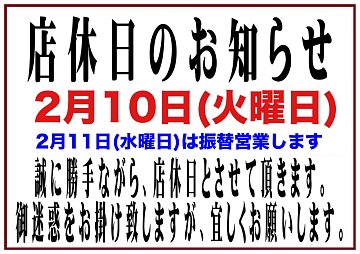 店舗定休日のお知らせ 2月10日(火曜日)は店舗定休日になります。 2月11日(水曜日)は振替営業します。