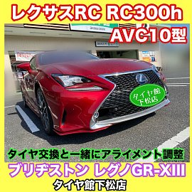 レクサスRC RC300h AVC10型 定期的なタイヤ交換と一緒にアライメント測定&調整実施です。装着するタイヤはブリヂストン レグノGR-XIII。