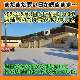 おはようございます。 寒波の影響で冷え込みも続いています。 皆さまは…愛車の冬の準備はお済みでしょうか? まだまだ寒い日は続きますので…愛車の冬支度がまだの方はタイヤ館下松店スタッフに相談して下さいね。 昨年2025年2月8日の店舗周辺の画像です。 タイヤ館下松店おすすめのスタッドレスタイ...