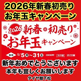 新年おめでとうございます。 本年もタイヤ館下松店を宜しくお願いします。 2026年新春初売りお年玉キャンペーン開催します。 開催期間:1月5日(月曜日)〜31日(土曜日)まで。