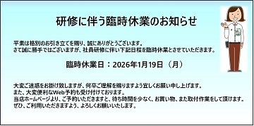 店舗からのお知らせ 本日 1月19日(月曜日) 社員研修の為 臨時休業させて頂きます。 店長:姫野