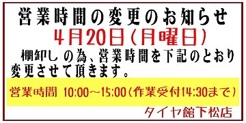 店舗からのお知らせ 営業時間変更のお知らせ 4月20日(月曜日) 棚卸しの為、営業時間を下記のとおり変更させていただきます。 営業時間 10:00〜15:00(作業受付14:30まで)