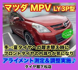 おはようございます。 いつもタイヤ館下松店のWEBをご覧頂き…ありがとうございます(^O^)タイヤ館下松店の越智です。 皆さまに…少しでも有益な情報や役立つ情報を発信出来るように日々更新していきたいと思います。 マツダ MPV LY3P型 冬タイヤから夏タイヤへの履き替え時にフロントタイヤの内減りが...