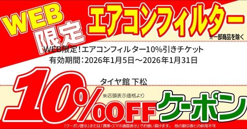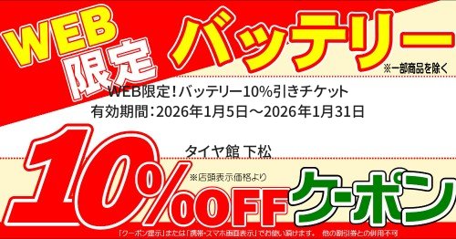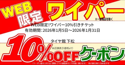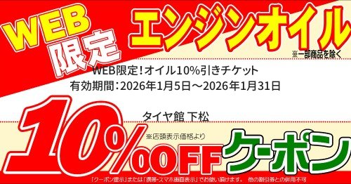 店長決裁★タイヤクーポン 有効期間:2026年1月5日~2026年1月31日 タイヤ館 下松店のみ有効です。 ※特価商品は対象外、他クーポンとの併用不可。 WEB限定!アライメント 有効期間:2026年1月5日~2026年1月31日 ★タイヤ館 下松店のみ有効です。 WEB限定!バッテリー10%引きチケット 有効期間:2026年1月5日~2026年1月31日 WEB限定!オイル10%引きチケット 有効期間:2026年1月5日~2026年1月31日 WEB限定!エアコンフィルター10%引きチケット 有効期間:2026年1月5日~2026年1月31日 WEB限定!ワイパー10%引きチケット 有効期間:2026年1月5日~2026年1月31日