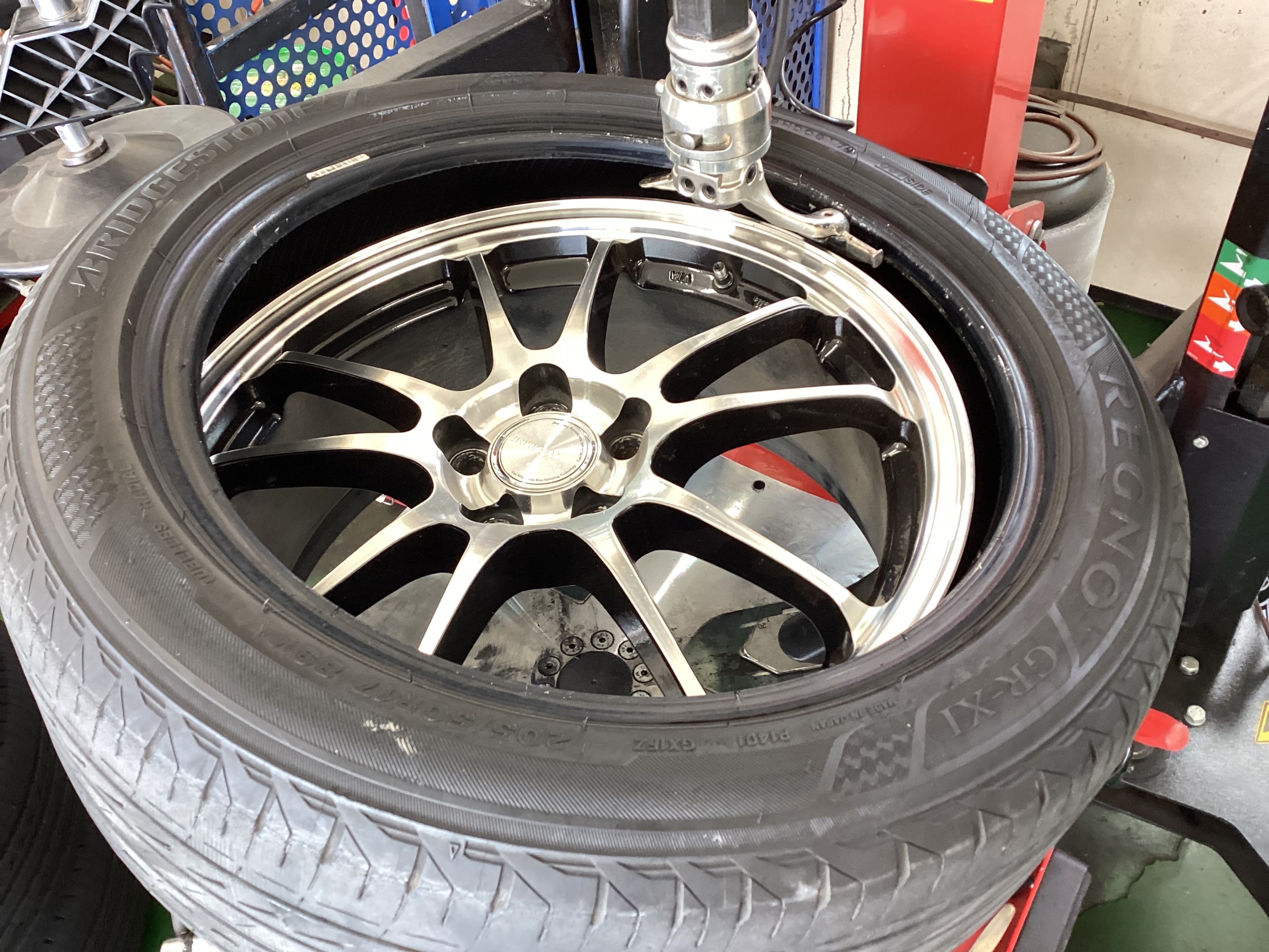 交換後は空気圧充填を行い、ホイールバランスを調整します。