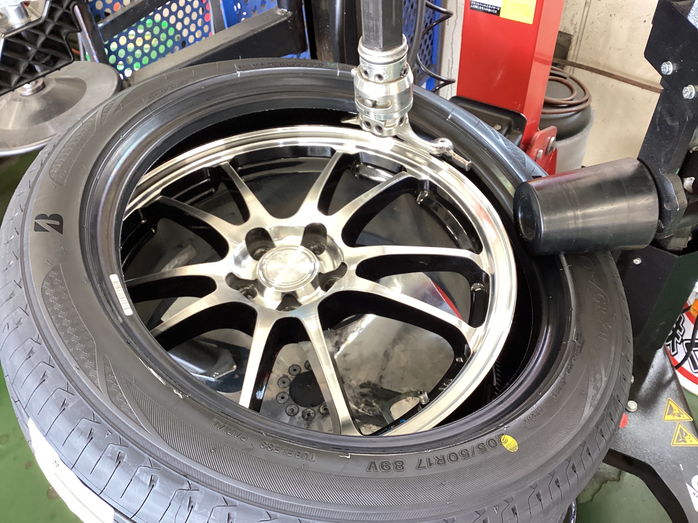 準備が出来たら専用機械にタイヤをセットし、タイヤ交換をしていきます。