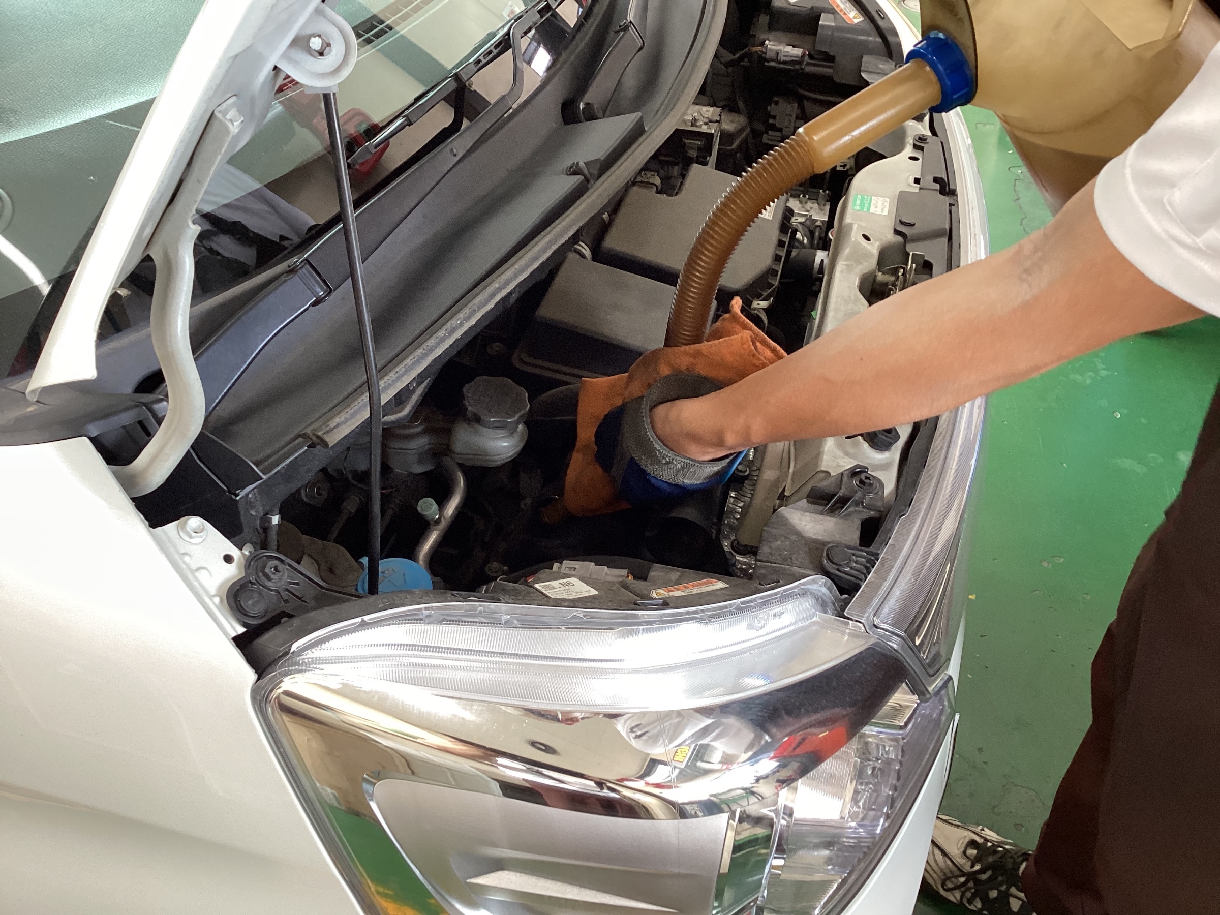 ドレンボルトを締め付けたあとは、車両をリフトダウンし新品のオイルを注入していきます。