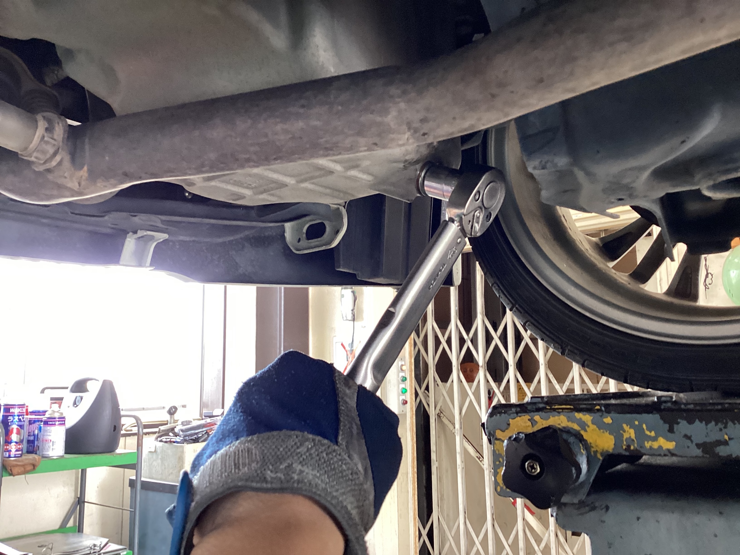 まずは車両をリフトアップし、ドレンボルトを外して古いオイルを抜き取ります。