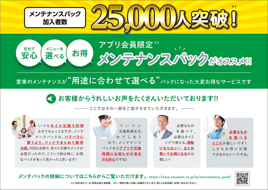『メンテナンスパック』は魅力的な料金設定となっており、当店のアプリ会員限定のサービスとしてご提供しております。