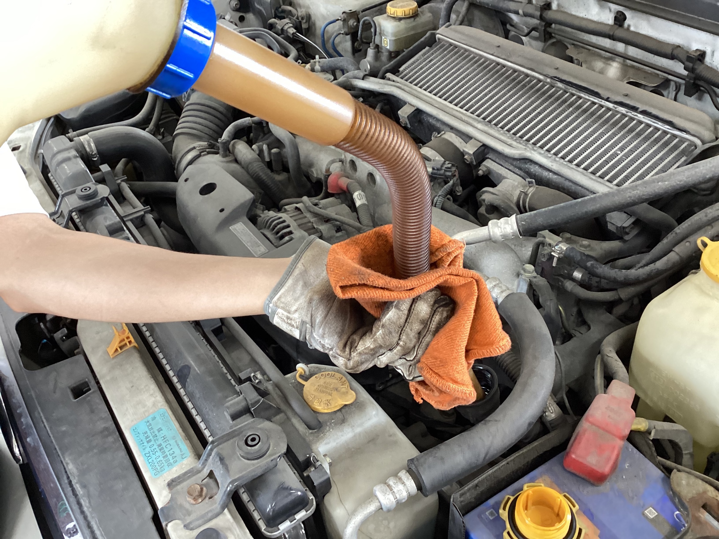 古いオイルを抜き終わったら車体を下げ、新しいオイルと交換していきます。