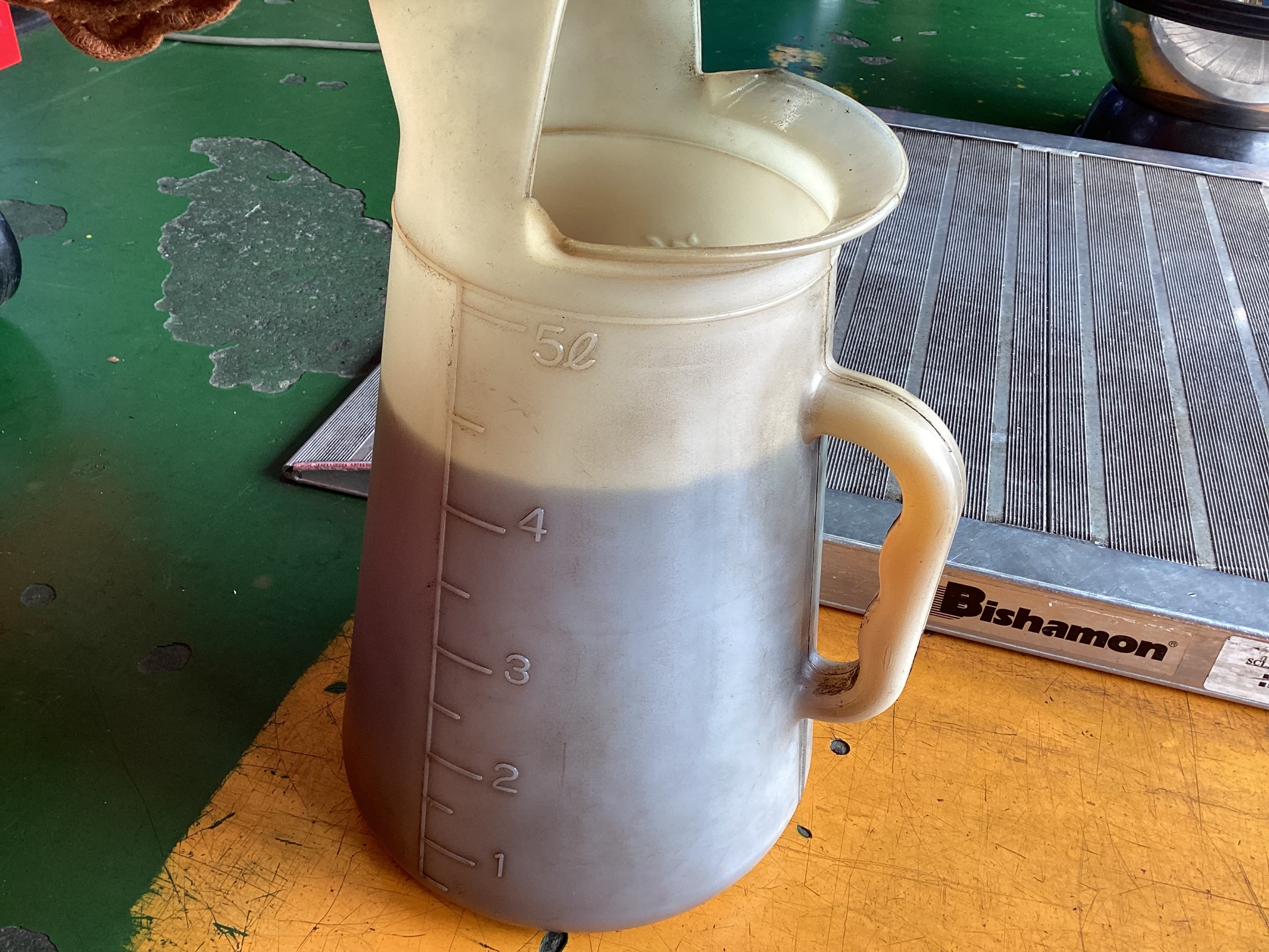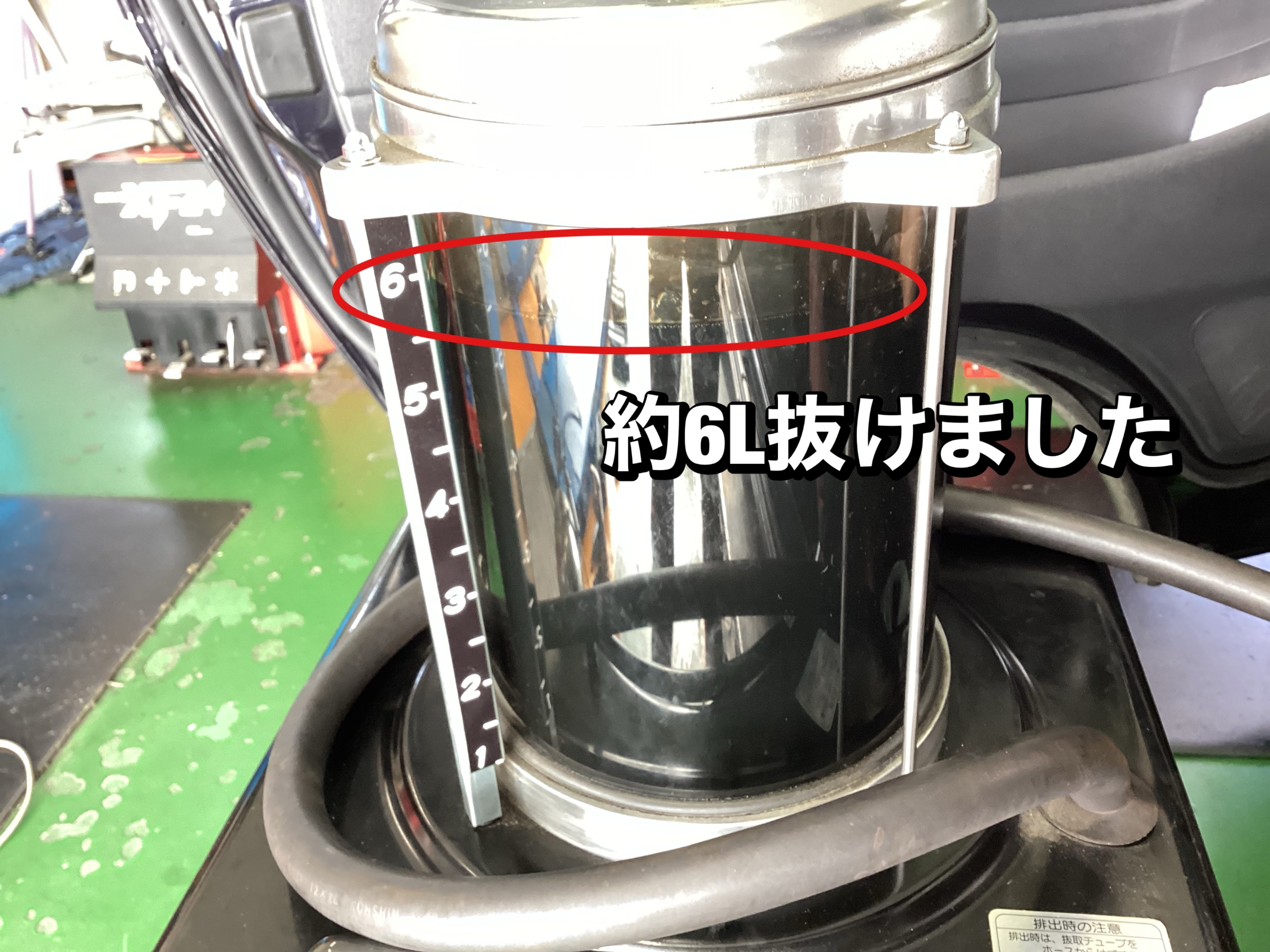 まずはオイルレベルゲージを抜いてホースを入れた後、古いオイルを吸い上げて抜いていきます。