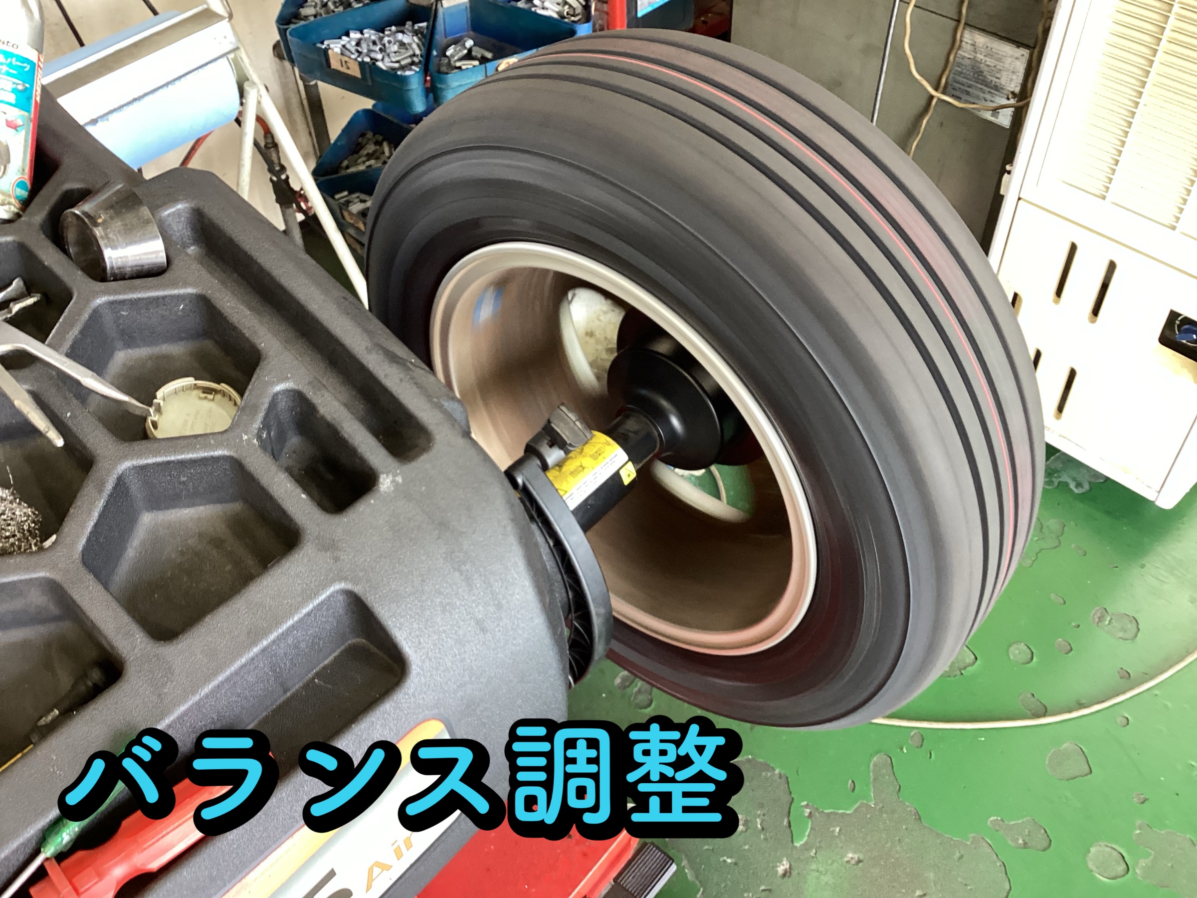 バランス調整とは、空気を充填したタイヤ・ホイールを専用の機械に取り付けて回転させ計測し、