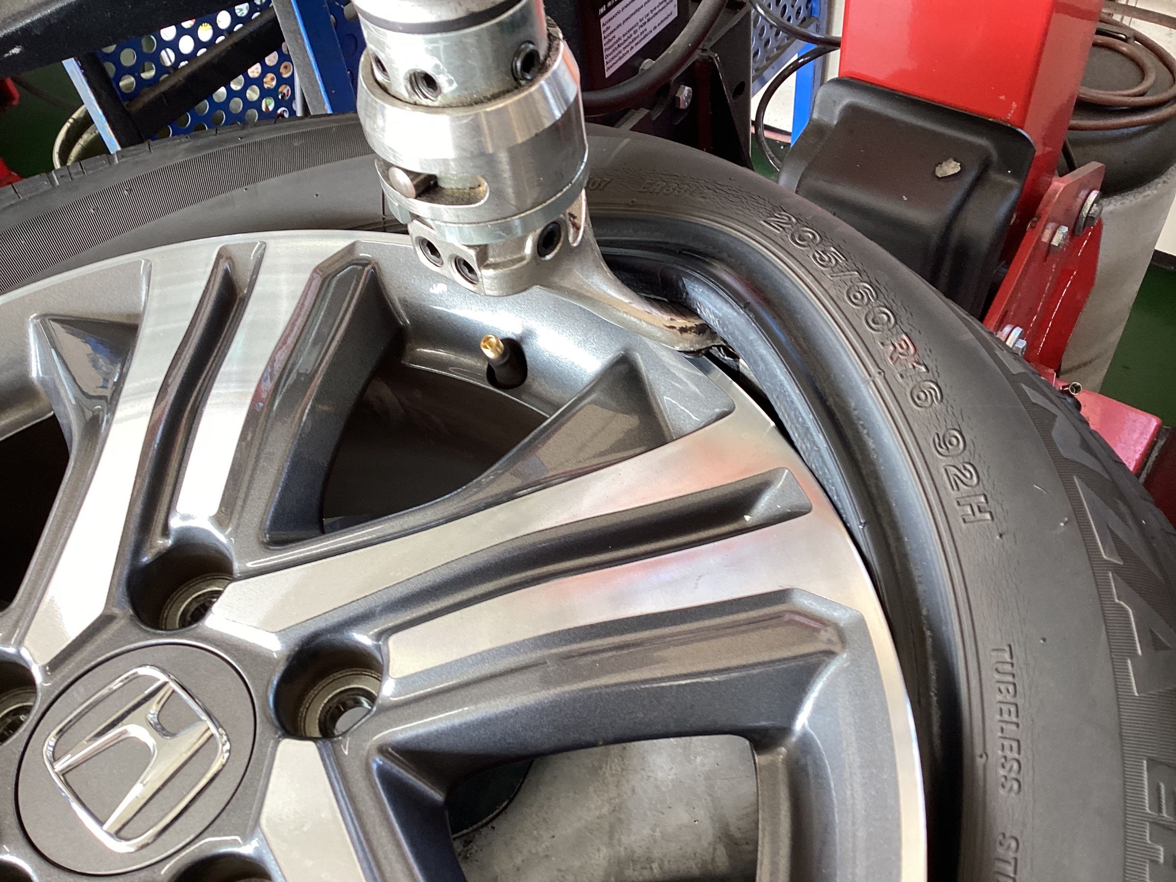 組んだタイヤに窒素ガスを充填し、バランスの調整をし、いよいよお車に装着していきます。