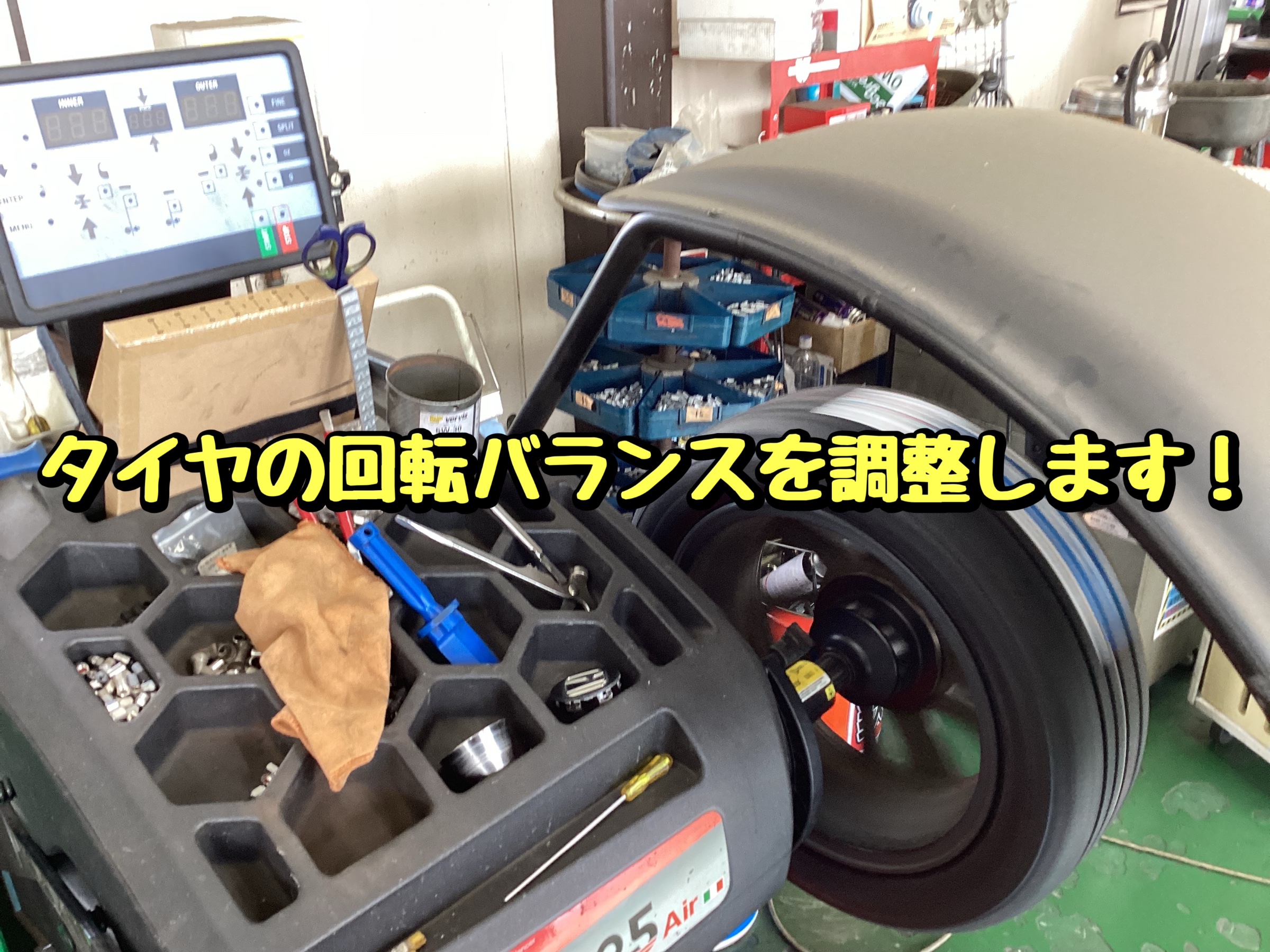 バランス調整とは、空気を充填したタイヤ・ホイールを専用の機械に取り付けて回転させ計測し、