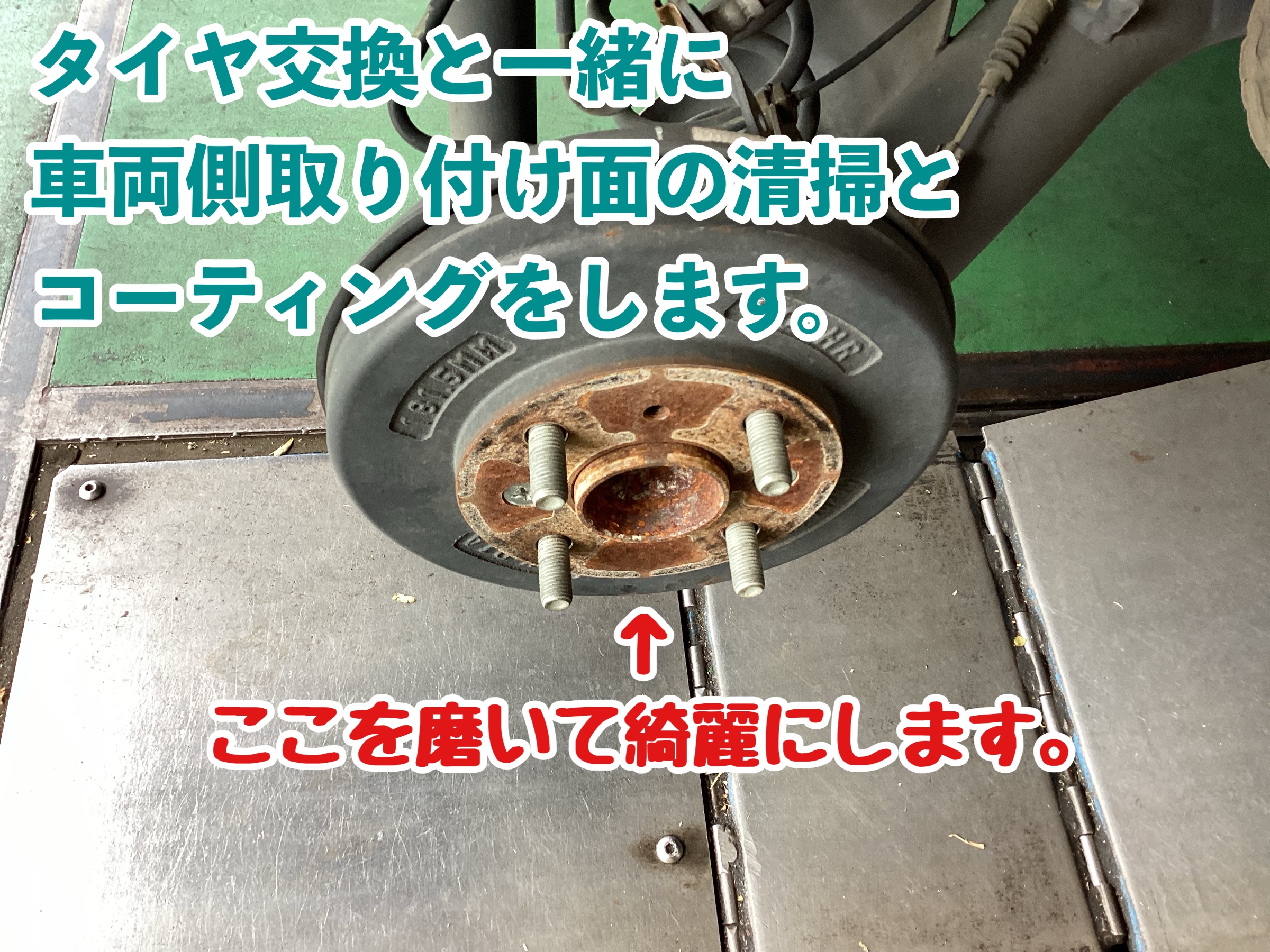 タイヤの交換・防錆コートが終わりましたので、新品タイヤを車両に取り付けます。
